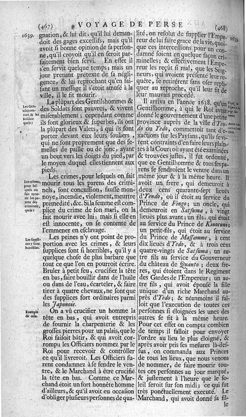 Voyages celebres & remarquables, faits de Perse aux Indes Orientales, par le sr. Jean-Albert de Mandelslo, gentilhomme des ambassadeurs du duc de Holstein en Moscovie & Perse. Contenant une description nouvelle & très-curieuse de l'Indostan, de l'empire du Grand-Mogol, des îles & presqu'îles de l'Orient, des royaumes de Siam, du Japon, de la Chine, du Congo, &c. Où l'on trouve la situation exacte de tous ces pays & etats ; & où l'on rapporte assez au long le naturel, les moeurs, & les coutumes de leurs habitans; leur gouvernement politique & ecclesiastique; les raretez qui se rencontrent dans ces pays; & les ceremonies qu'on y observe. Mis en ordre & publiez, après la mort de l'illustre voyageur, par le sr. Adam Olearius... Traduits de l'original par le sr. A. De Wicquefort ... Divisez en deux parties. Nouvelle edition revûe & corrigée exactement, augmentée considerablement, tant dans le corps de l'ouvrage qu'aux marginales, & surpassant en bonté & en beauté les précedentes editions. On y a encore ajouté des cartes géographiques, des représentations des villes, & autres taille-douces très-belles & très-exactes. On y trouve à la fin une Table fort ample & fort exacte. Tome premier [-second].