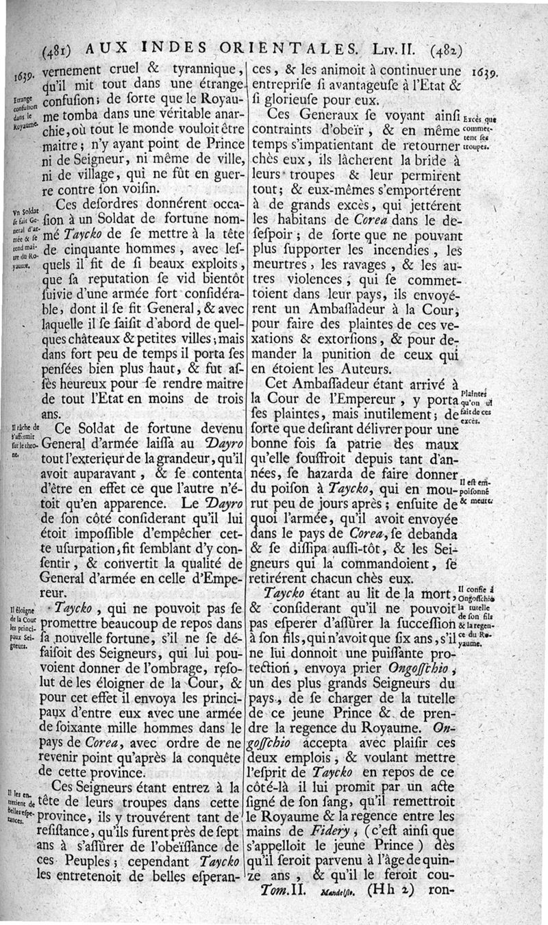 Voyages celebres & remarquables, faits de Perse aux Indes Orientales, par le sr. Jean-Albert de Mandelslo, gentilhomme des ambassadeurs du duc de Holstein en Moscovie & Perse. Contenant une description nouvelle & très-curieuse de l'Indostan, de l'empire du Grand-Mogol, des îles & presqu'îles de l'Orient, des royaumes de Siam, du Japon, de la Chine, du Congo, &c. Où l'on trouve la situation exacte de tous ces pays & etats ; & où l'on rapporte assez au long le naturel, les moeurs, & les coutumes de leurs habitans; leur gouvernement politique & ecclesiastique; les raretez qui se rencontrent dans ces pays; & les ceremonies qu'on y observe. Mis en ordre & publiez, après la mort de l'illustre voyageur, par le sr. Adam Olearius... Traduits de l'original par le sr. A. De Wicquefort ... Divisez en deux parties. Nouvelle edition revûe & corrigée exactement, augmentée considerablement, tant dans le corps de l'ouvrage qu'aux marginales, & surpassant en bonté & en beauté les précedentes editions. On y a encore ajouté des cartes géographiques, des représentations des villes, & autres taille-douces très-belles & très-exactes. On y trouve à la fin une Table fort ample & fort exacte. Tome premier [-second].