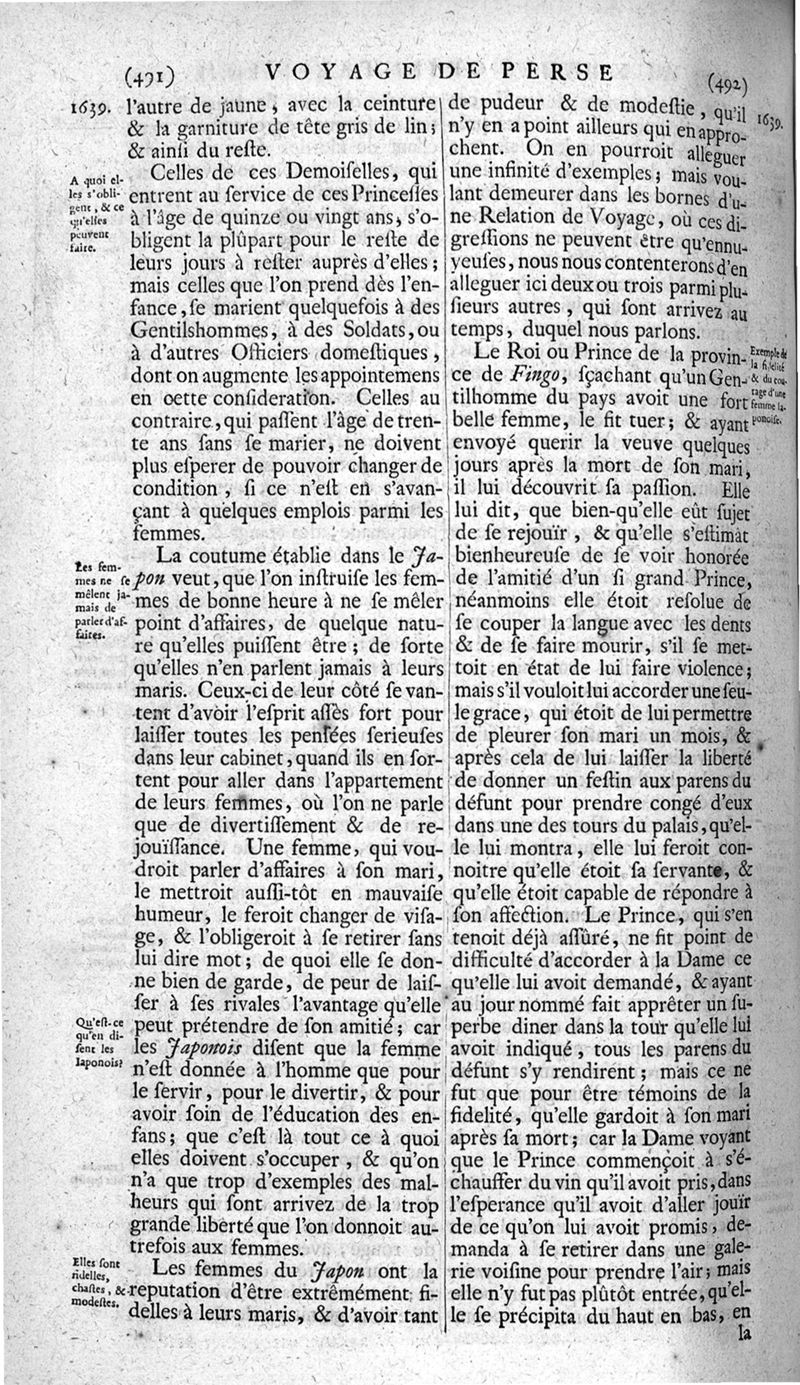 Voyages celebres & remarquables, faits de Perse aux Indes Orientales, par le sr. Jean-Albert de Mandelslo, gentilhomme des ambassadeurs du duc de Holstein en Moscovie & Perse. Contenant une description nouvelle & très-curieuse de l'Indostan, de l'empire du Grand-Mogol, des îles & presqu'îles de l'Orient, des royaumes de Siam, du Japon, de la Chine, du Congo, &c. Où l'on trouve la situation exacte de tous ces pays & etats ; & où l'on rapporte assez au long le naturel, les moeurs, & les coutumes de leurs habitans; leur gouvernement politique & ecclesiastique; les raretez qui se rencontrent dans ces pays; & les ceremonies qu'on y observe. Mis en ordre & publiez, après la mort de l'illustre voyageur, par le sr. Adam Olearius... Traduits de l'original par le sr. A. De Wicquefort ... Divisez en deux parties. Nouvelle edition revûe & corrigée exactement, augmentée considerablement, tant dans le corps de l'ouvrage qu'aux marginales, & surpassant en bonté & en beauté les précedentes editions. On y a encore ajouté des cartes géographiques, des représentations des villes, & autres taille-douces très-belles & très-exactes. On y trouve à la fin une Table fort ample & fort exacte. Tome premier [-second].