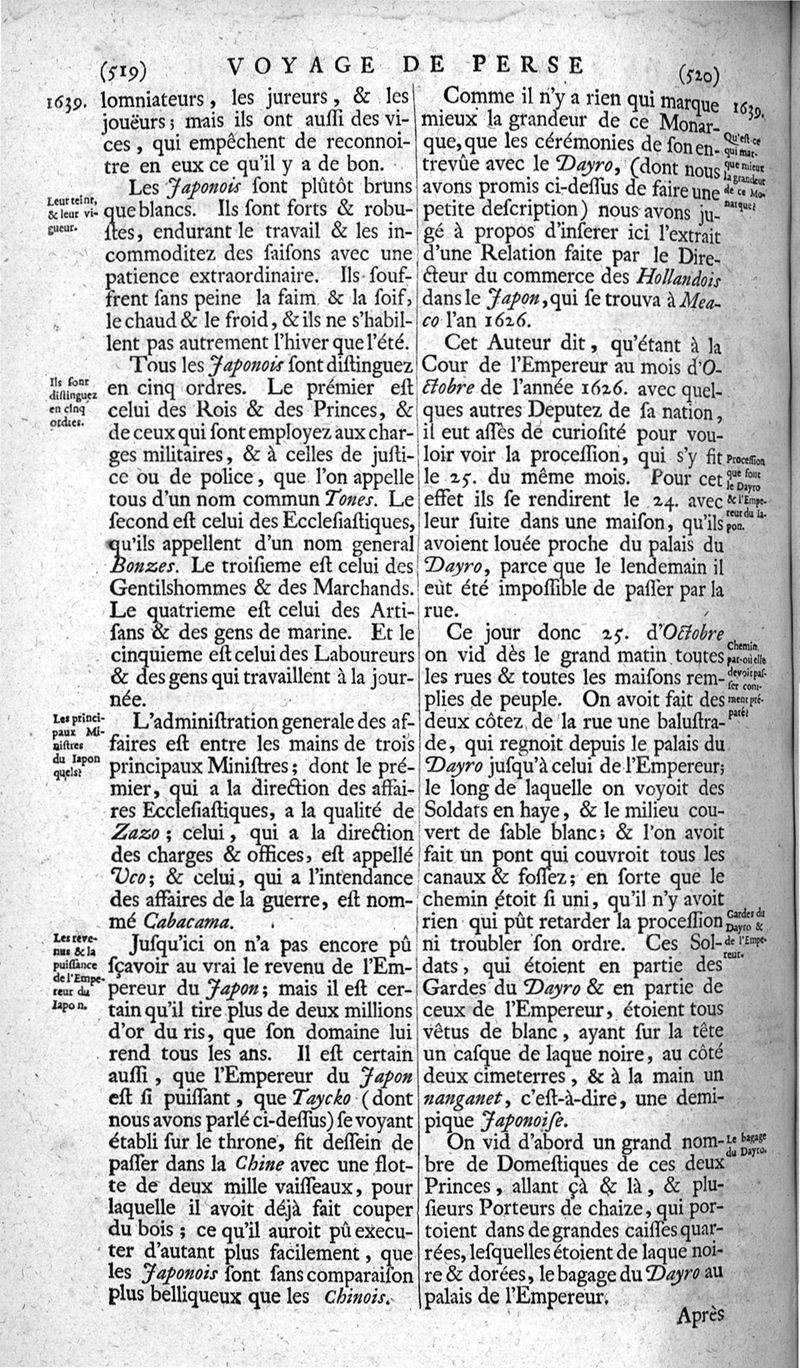 Voyages celebres & remarquables, faits de Perse aux Indes Orientales, par le sr. Jean-Albert de Mandelslo, gentilhomme des ambassadeurs du duc de Holstein en Moscovie & Perse. Contenant une description nouvelle & très-curieuse de l'Indostan, de l'empire du Grand-Mogol, des îles & presqu'îles de l'Orient, des royaumes de Siam, du Japon, de la Chine, du Congo, &c. Où l'on trouve la situation exacte de tous ces pays & etats ; & où l'on rapporte assez au long le naturel, les moeurs, & les coutumes de leurs habitans; leur gouvernement politique & ecclesiastique; les raretez qui se rencontrent dans ces pays; & les ceremonies qu'on y observe. Mis en ordre & publiez, après la mort de l'illustre voyageur, par le sr. Adam Olearius... Traduits de l'original par le sr. A. De Wicquefort ... Divisez en deux parties. Nouvelle edition revûe & corrigée exactement, augmentée considerablement, tant dans le corps de l'ouvrage qu'aux marginales, & surpassant en bonté & en beauté les précedentes editions. On y a encore ajouté des cartes géographiques, des représentations des villes, & autres taille-douces très-belles & très-exactes. On y trouve à la fin une Table fort ample & fort exacte. Tome premier [-second].