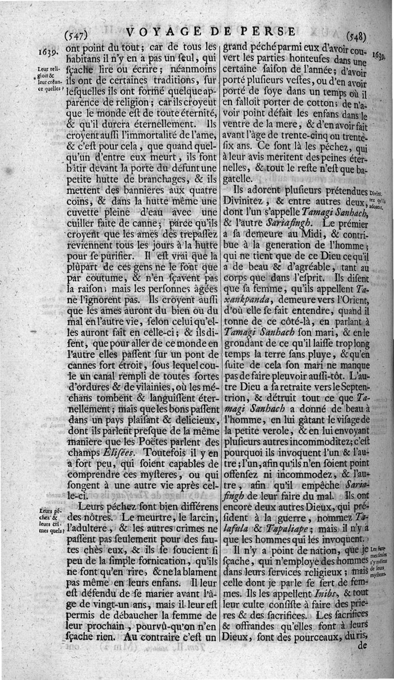Voyages celebres & remarquables, faits de Perse aux Indes Orientales, par le sr. Jean-Albert de Mandelslo, gentilhomme des ambassadeurs du duc de Holstein en Moscovie & Perse. Contenant une description nouvelle & très-curieuse de l'Indostan, de l'empire du Grand-Mogol, des îles & presqu'îles de l'Orient, des royaumes de Siam, du Japon, de la Chine, du Congo, &c. Où l'on trouve la situation exacte de tous ces pays & etats ; & où l'on rapporte assez au long le naturel, les moeurs, & les coutumes de leurs habitans; leur gouvernement politique & ecclesiastique; les raretez qui se rencontrent dans ces pays; & les ceremonies qu'on y observe. Mis en ordre & publiez, après la mort de l'illustre voyageur, par le sr. Adam Olearius... Traduits de l'original par le sr. A. De Wicquefort ... Divisez en deux parties. Nouvelle edition revûe & corrigée exactement, augmentée considerablement, tant dans le corps de l'ouvrage qu'aux marginales, & surpassant en bonté & en beauté les précedentes editions. On y a encore ajouté des cartes géographiques, des représentations des villes, & autres taille-douces très-belles & très-exactes. On y trouve à la fin une Table fort ample & fort exacte. Tome premier [-second].