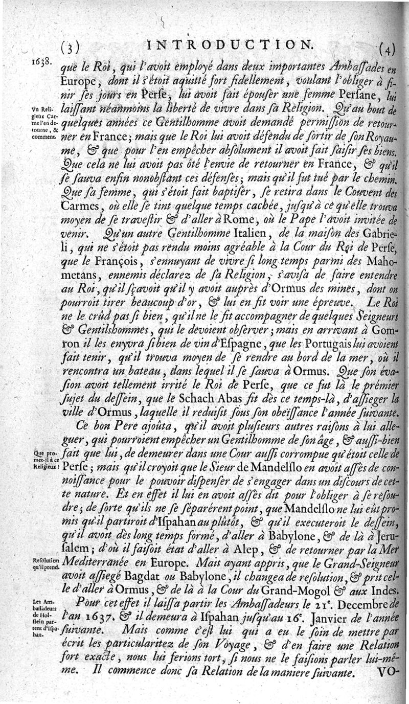 Voyages celebres & remarquables, faits de Perse aux Indes Orientales, par le sr. Jean-Albert de Mandelslo, gentilhomme des ambassadeurs du duc de Holstein en Moscovie & Perse. Contenant une description nouvelle & très-curieuse de l'Indostan, de l'empire du Grand-Mogol, des îles & presqu'îles de l'Orient, des royaumes de Siam, du Japon, de la Chine, du Congo, &c. Où l'on trouve la situation exacte de tous ces pays & etats ; & où l'on rapporte assez au long le naturel, les moeurs, & les coutumes de leurs habitans; leur gouvernement politique & ecclesiastique; les raretez qui se rencontrent dans ces pays; & les ceremonies qu'on y observe. Mis en ordre & publiez, après la mort de l'illustre voyageur, par le sr. Adam Olearius... Traduits de l'original par le sr. A. De Wicquefort ... Divisez en deux parties. Nouvelle edition revûe & corrigée exactement, augmentée considerablement, tant dans le corps de l'ouvrage qu'aux marginales, & surpassant en bonté & en beauté les précedentes editions. On y a encore ajouté des cartes géographiques, des représentations des villes, & autres taille-douces très-belles & très-exactes. On y trouve à la fin une Table fort ample & fort exacte. Tome premier [-second].