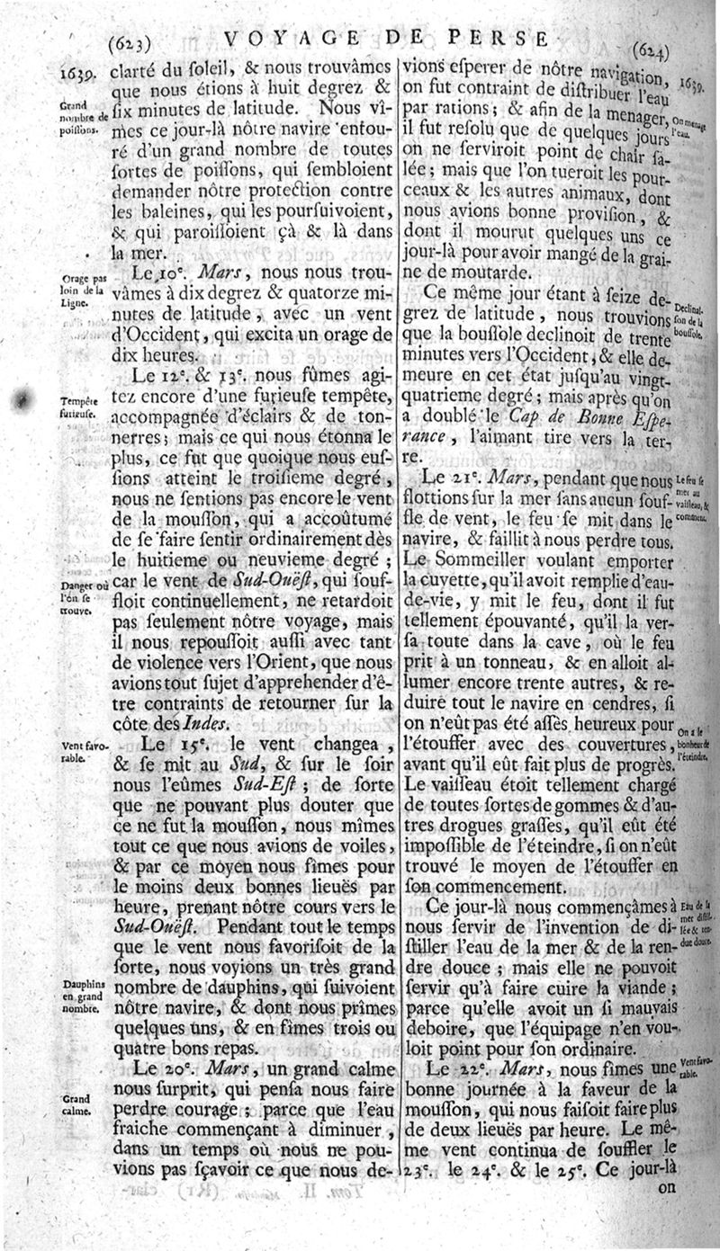 Voyages celebres & remarquables, faits de Perse aux Indes Orientales, par le sr. Jean-Albert de Mandelslo, gentilhomme des ambassadeurs du duc de Holstein en Moscovie & Perse. Contenant une description nouvelle & très-curieuse de l'Indostan, de l'empire du Grand-Mogol, des îles & presqu'îles de l'Orient, des royaumes de Siam, du Japon, de la Chine, du Congo, &c. Où l'on trouve la situation exacte de tous ces pays & etats ; & où l'on rapporte assez au long le naturel, les moeurs, & les coutumes de leurs habitans; leur gouvernement politique & ecclesiastique; les raretez qui se rencontrent dans ces pays; & les ceremonies qu'on y observe. Mis en ordre & publiez, après la mort de l'illustre voyageur, par le sr. Adam Olearius... Traduits de l'original par le sr. A. De Wicquefort ... Divisez en deux parties. Nouvelle edition revûe & corrigée exactement, augmentée considerablement, tant dans le corps de l'ouvrage qu'aux marginales, & surpassant en bonté & en beauté les précedentes editions. On y a encore ajouté des cartes géographiques, des représentations des villes, & autres taille-douces très-belles & très-exactes. On y trouve à la fin une Table fort ample & fort exacte. Tome premier [-second].
