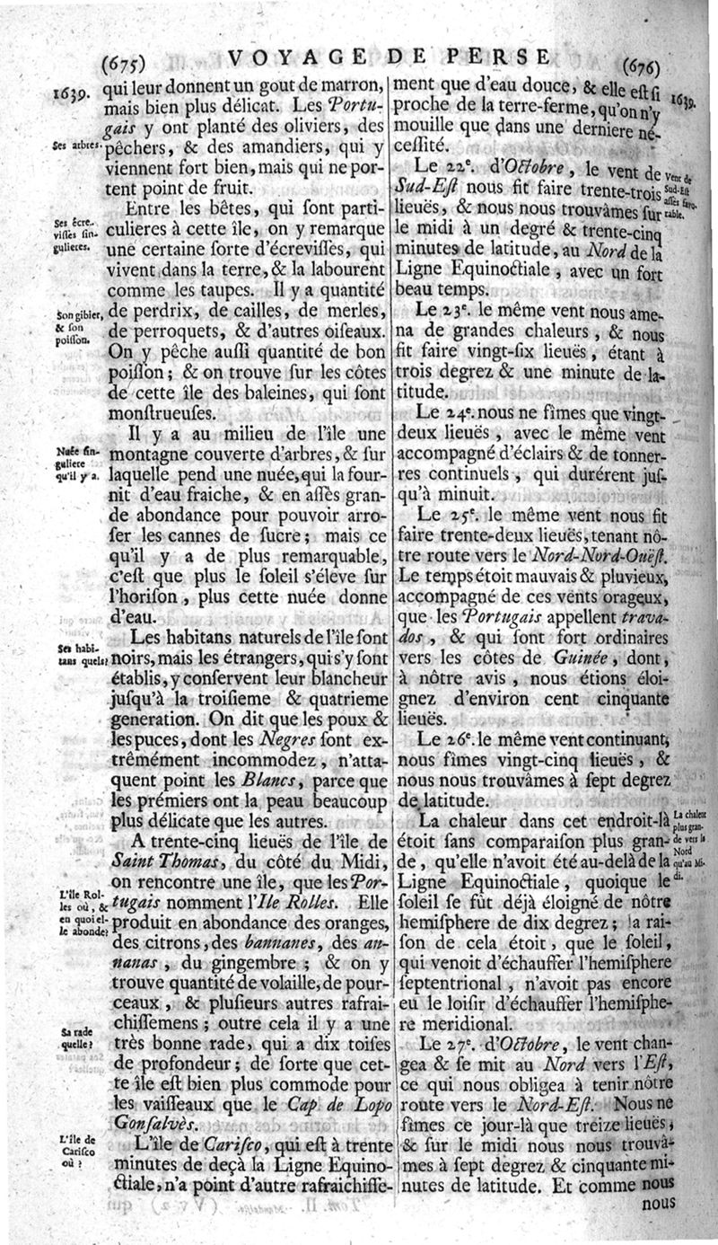 Voyages celebres & remarquables, faits de Perse aux Indes Orientales, par le sr. Jean-Albert de Mandelslo, gentilhomme des ambassadeurs du duc de Holstein en Moscovie & Perse. Contenant une description nouvelle & très-curieuse de l'Indostan, de l'empire du Grand-Mogol, des îles & presqu'îles de l'Orient, des royaumes de Siam, du Japon, de la Chine, du Congo, &c. Où l'on trouve la situation exacte de tous ces pays & etats ; & où l'on rapporte assez au long le naturel, les moeurs, & les coutumes de leurs habitans; leur gouvernement politique & ecclesiastique; les raretez qui se rencontrent dans ces pays; & les ceremonies qu'on y observe. Mis en ordre & publiez, après la mort de l'illustre voyageur, par le sr. Adam Olearius... Traduits de l'original par le sr. A. De Wicquefort ... Divisez en deux parties. Nouvelle edition revûe & corrigée exactement, augmentée considerablement, tant dans le corps de l'ouvrage qu'aux marginales, & surpassant en bonté & en beauté les précedentes editions. On y a encore ajouté des cartes géographiques, des représentations des villes, & autres taille-douces très-belles & très-exactes. On y trouve à la fin une Table fort ample & fort exacte. Tome premier [-second].
