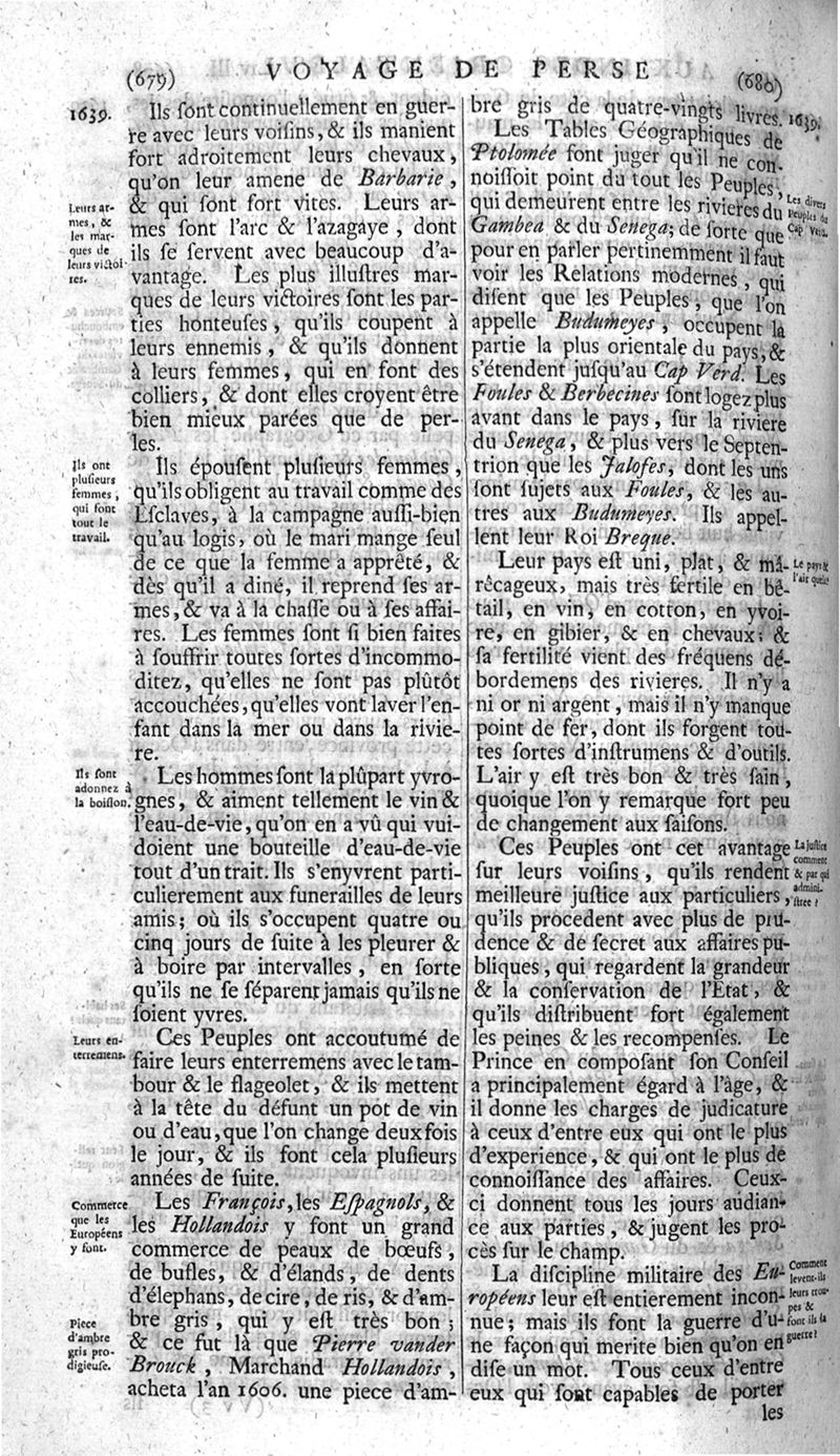 Voyages celebres & remarquables, faits de Perse aux Indes Orientales, par le sr. Jean-Albert de Mandelslo, gentilhomme des ambassadeurs du duc de Holstein en Moscovie & Perse. Contenant une description nouvelle & très-curieuse de l'Indostan, de l'empire du Grand-Mogol, des îles & presqu'îles de l'Orient, des royaumes de Siam, du Japon, de la Chine, du Congo, &c. Où l'on trouve la situation exacte de tous ces pays & etats ; & où l'on rapporte assez au long le naturel, les moeurs, & les coutumes de leurs habitans; leur gouvernement politique & ecclesiastique; les raretez qui se rencontrent dans ces pays; & les ceremonies qu'on y observe. Mis en ordre & publiez, après la mort de l'illustre voyageur, par le sr. Adam Olearius... Traduits de l'original par le sr. A. De Wicquefort ... Divisez en deux parties. Nouvelle edition revûe & corrigée exactement, augmentée considerablement, tant dans le corps de l'ouvrage qu'aux marginales, & surpassant en bonté & en beauté les précedentes editions. On y a encore ajouté des cartes géographiques, des représentations des villes, & autres taille-douces très-belles & très-exactes. On y trouve à la fin une Table fort ample & fort exacte. Tome premier [-second].