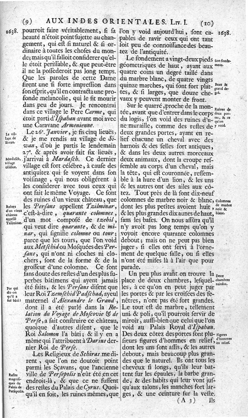 Voyages celebres & remarquables, faits de Perse aux Indes Orientales, par le sr. Jean-Albert de Mandelslo, gentilhomme des ambassadeurs du duc de Holstein en Moscovie & Perse. Contenant une description nouvelle & très-curieuse de l'Indostan, de l'empire du Grand-Mogol, des îles & presqu'îles de l'Orient, des royaumes de Siam, du Japon, de la Chine, du Congo, &c. Où l'on trouve la situation exacte de tous ces pays & etats ; & où l'on rapporte assez au long le naturel, les moeurs, & les coutumes de leurs habitans; leur gouvernement politique & ecclesiastique; les raretez qui se rencontrent dans ces pays; & les ceremonies qu'on y observe. Mis en ordre & publiez, après la mort de l'illustre voyageur, par le sr. Adam Olearius... Traduits de l'original par le sr. A. De Wicquefort ... Divisez en deux parties. Nouvelle edition revûe & corrigée exactement, augmentée considerablement, tant dans le corps de l'ouvrage qu'aux marginales, & surpassant en bonté & en beauté les précedentes editions. On y a encore ajouté des cartes géographiques, des représentations des villes, & autres taille-douces très-belles & très-exactes. On y trouve à la fin une Table fort ample & fort exacte. Tome premier [-second].