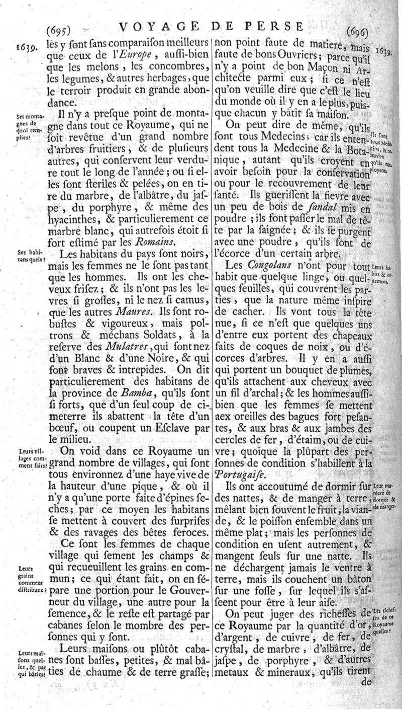 Voyages celebres & remarquables, faits de Perse aux Indes Orientales, par le sr. Jean-Albert de Mandelslo, gentilhomme des ambassadeurs du duc de Holstein en Moscovie & Perse. Contenant une description nouvelle & très-curieuse de l'Indostan, de l'empire du Grand-Mogol, des îles & presqu'îles de l'Orient, des royaumes de Siam, du Japon, de la Chine, du Congo, &c. Où l'on trouve la situation exacte de tous ces pays & etats ; & où l'on rapporte assez au long le naturel, les moeurs, & les coutumes de leurs habitans; leur gouvernement politique & ecclesiastique; les raretez qui se rencontrent dans ces pays; & les ceremonies qu'on y observe. Mis en ordre & publiez, après la mort de l'illustre voyageur, par le sr. Adam Olearius... Traduits de l'original par le sr. A. De Wicquefort ... Divisez en deux parties. Nouvelle edition revûe & corrigée exactement, augmentée considerablement, tant dans le corps de l'ouvrage qu'aux marginales, & surpassant en bonté & en beauté les précedentes editions. On y a encore ajouté des cartes géographiques, des représentations des villes, & autres taille-douces très-belles & très-exactes. On y trouve à la fin une Table fort ample & fort exacte. Tome premier [-second].