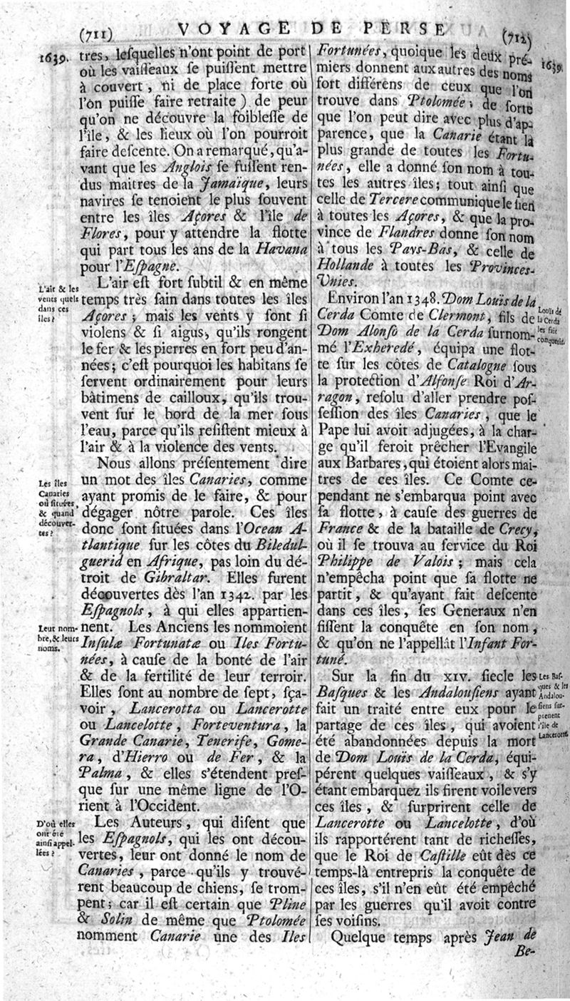 Voyages celebres & remarquables, faits de Perse aux Indes Orientales, par le sr. Jean-Albert de Mandelslo, gentilhomme des ambassadeurs du duc de Holstein en Moscovie & Perse. Contenant une description nouvelle & très-curieuse de l'Indostan, de l'empire du Grand-Mogol, des îles & presqu'îles de l'Orient, des royaumes de Siam, du Japon, de la Chine, du Congo, &c. Où l'on trouve la situation exacte de tous ces pays & etats ; & où l'on rapporte assez au long le naturel, les moeurs, & les coutumes de leurs habitans; leur gouvernement politique & ecclesiastique; les raretez qui se rencontrent dans ces pays; & les ceremonies qu'on y observe. Mis en ordre & publiez, après la mort de l'illustre voyageur, par le sr. Adam Olearius... Traduits de l'original par le sr. A. De Wicquefort ... Divisez en deux parties. Nouvelle edition revûe & corrigée exactement, augmentée considerablement, tant dans le corps de l'ouvrage qu'aux marginales, & surpassant en bonté & en beauté les précedentes editions. On y a encore ajouté des cartes géographiques, des représentations des villes, & autres taille-douces très-belles & très-exactes. On y trouve à la fin une Table fort ample & fort exacte. Tome premier [-second].
