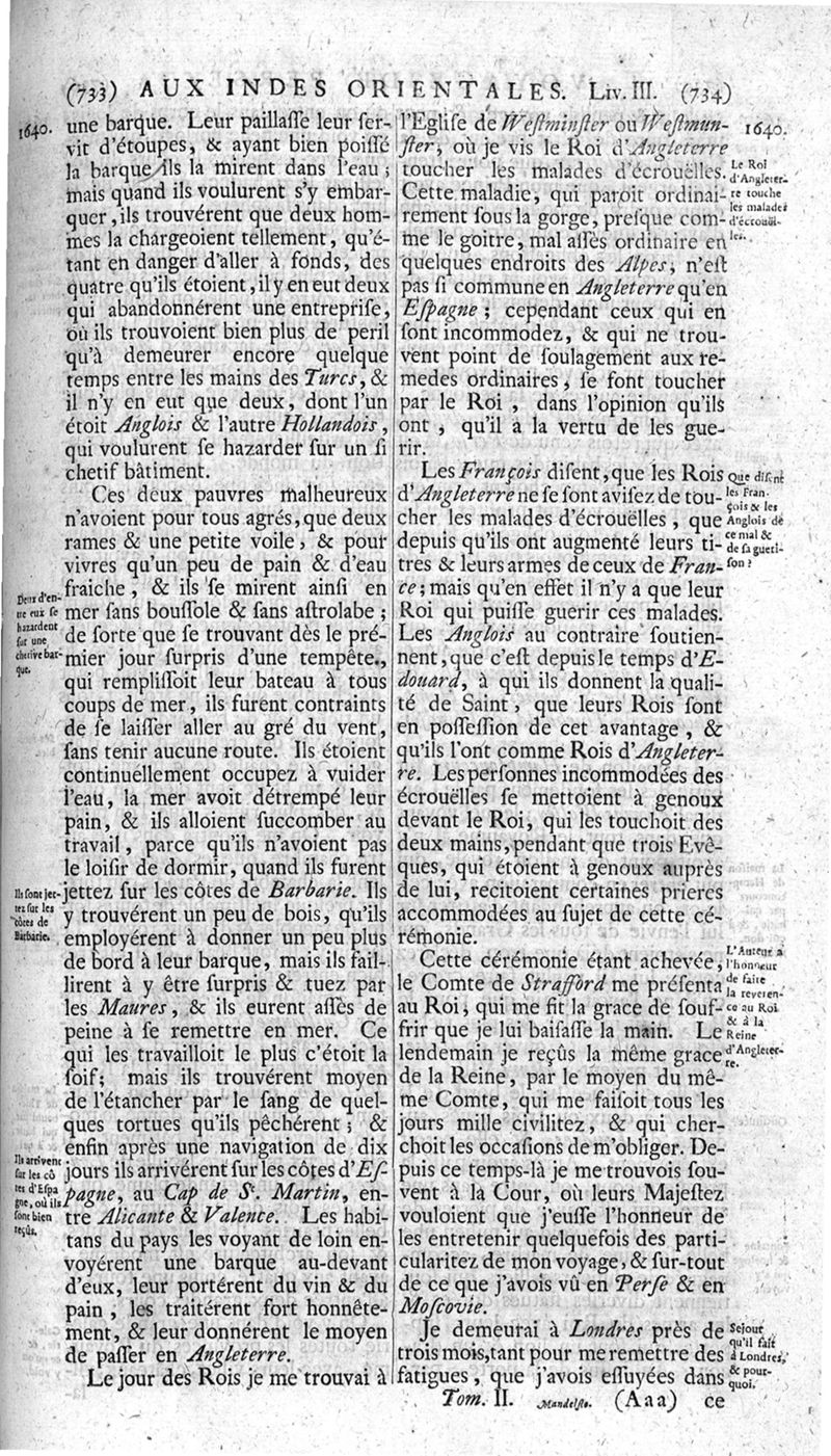Voyages celebres & remarquables, faits de Perse aux Indes Orientales, par le sr. Jean-Albert de Mandelslo, gentilhomme des ambassadeurs du duc de Holstein en Moscovie & Perse. Contenant une description nouvelle & très-curieuse de l'Indostan, de l'empire du Grand-Mogol, des îles & presqu'îles de l'Orient, des royaumes de Siam, du Japon, de la Chine, du Congo, &c. Où l'on trouve la situation exacte de tous ces pays & etats ; & où l'on rapporte assez au long le naturel, les moeurs, & les coutumes de leurs habitans; leur gouvernement politique & ecclesiastique; les raretez qui se rencontrent dans ces pays; & les ceremonies qu'on y observe. Mis en ordre & publiez, après la mort de l'illustre voyageur, par le sr. Adam Olearius... Traduits de l'original par le sr. A. De Wicquefort ... Divisez en deux parties. Nouvelle edition revûe & corrigée exactement, augmentée considerablement, tant dans le corps de l'ouvrage qu'aux marginales, & surpassant en bonté & en beauté les précedentes editions. On y a encore ajouté des cartes géographiques, des représentations des villes, & autres taille-douces très-belles & très-exactes. On y trouve à la fin une Table fort ample & fort exacte. Tome premier [-second].