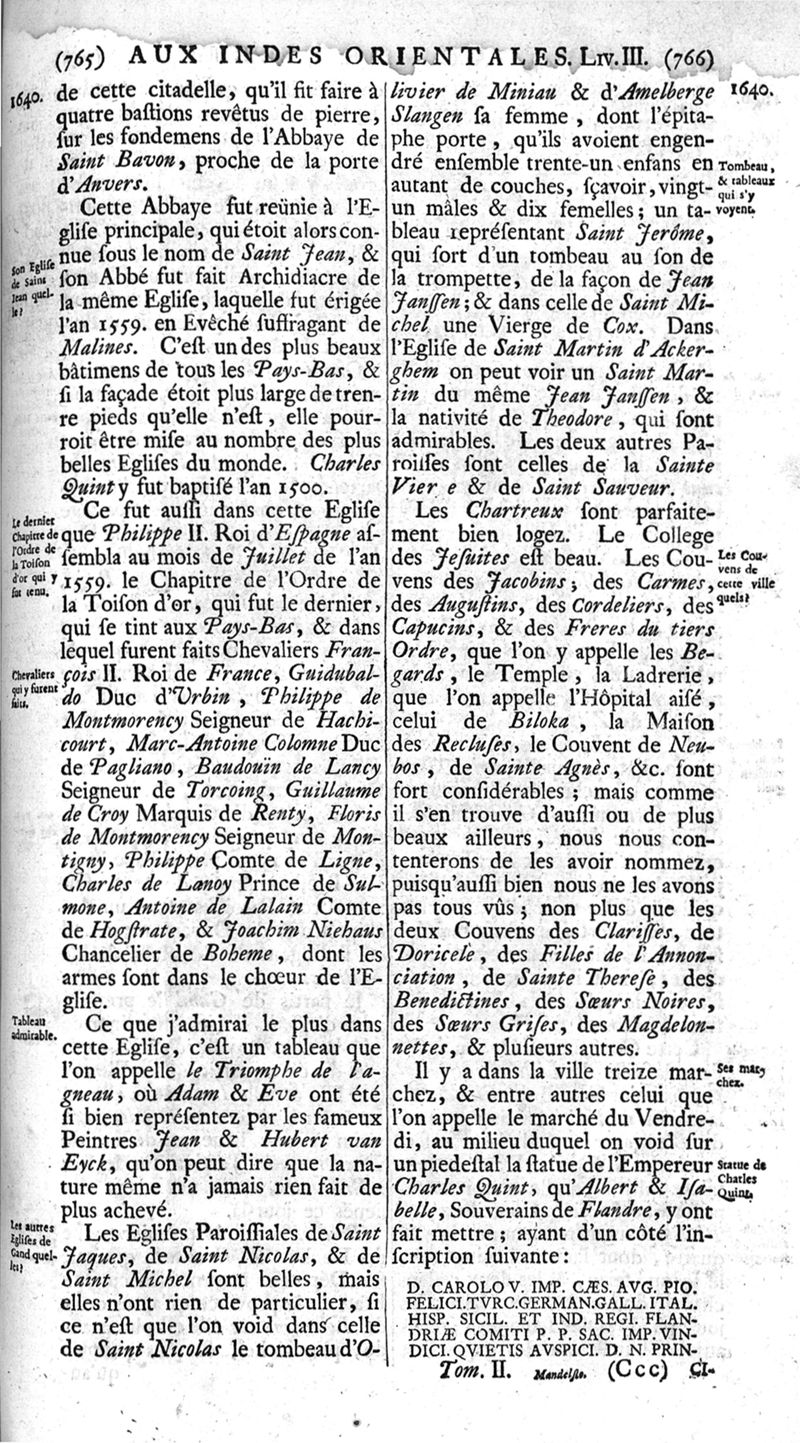 Voyages celebres & remarquables, faits de Perse aux Indes Orientales, par le sr. Jean-Albert de Mandelslo, gentilhomme des ambassadeurs du duc de Holstein en Moscovie & Perse. Contenant une description nouvelle & très-curieuse de l'Indostan, de l'empire du Grand-Mogol, des îles & presqu'îles de l'Orient, des royaumes de Siam, du Japon, de la Chine, du Congo, &c. Où l'on trouve la situation exacte de tous ces pays & etats ; & où l'on rapporte assez au long le naturel, les moeurs, & les coutumes de leurs habitans; leur gouvernement politique & ecclesiastique; les raretez qui se rencontrent dans ces pays; & les ceremonies qu'on y observe. Mis en ordre & publiez, après la mort de l'illustre voyageur, par le sr. Adam Olearius... Traduits de l'original par le sr. A. De Wicquefort ... Divisez en deux parties. Nouvelle edition revûe & corrigée exactement, augmentée considerablement, tant dans le corps de l'ouvrage qu'aux marginales, & surpassant en bonté & en beauté les précedentes editions. On y a encore ajouté des cartes géographiques, des représentations des villes, & autres taille-douces très-belles & très-exactes. On y trouve à la fin une Table fort ample & fort exacte. Tome premier [-second].