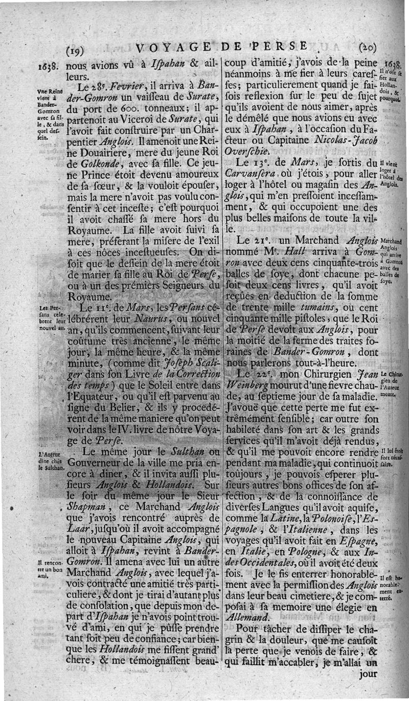 Voyages celebres & remarquables, faits de Perse aux Indes Orientales, par le sr. Jean-Albert de Mandelslo, gentilhomme des ambassadeurs du duc de Holstein en Moscovie & Perse. Contenant une description nouvelle & très-curieuse de l'Indostan, de l'empire du Grand-Mogol, des îles & presqu'îles de l'Orient, des royaumes de Siam, du Japon, de la Chine, du Congo, &c. Où l'on trouve la situation exacte de tous ces pays & etats ; & où l'on rapporte assez au long le naturel, les moeurs, & les coutumes de leurs habitans; leur gouvernement politique & ecclesiastique; les raretez qui se rencontrent dans ces pays; & les ceremonies qu'on y observe. Mis en ordre & publiez, après la mort de l'illustre voyageur, par le sr. Adam Olearius... Traduits de l'original par le sr. A. De Wicquefort ... Divisez en deux parties. Nouvelle edition revûe & corrigée exactement, augmentée considerablement, tant dans le corps de l'ouvrage qu'aux marginales, & surpassant en bonté & en beauté les précedentes editions. On y a encore ajouté des cartes géographiques, des représentations des villes, & autres taille-douces très-belles & très-exactes. On y trouve à la fin une Table fort ample & fort exacte. Tome premier [-second].