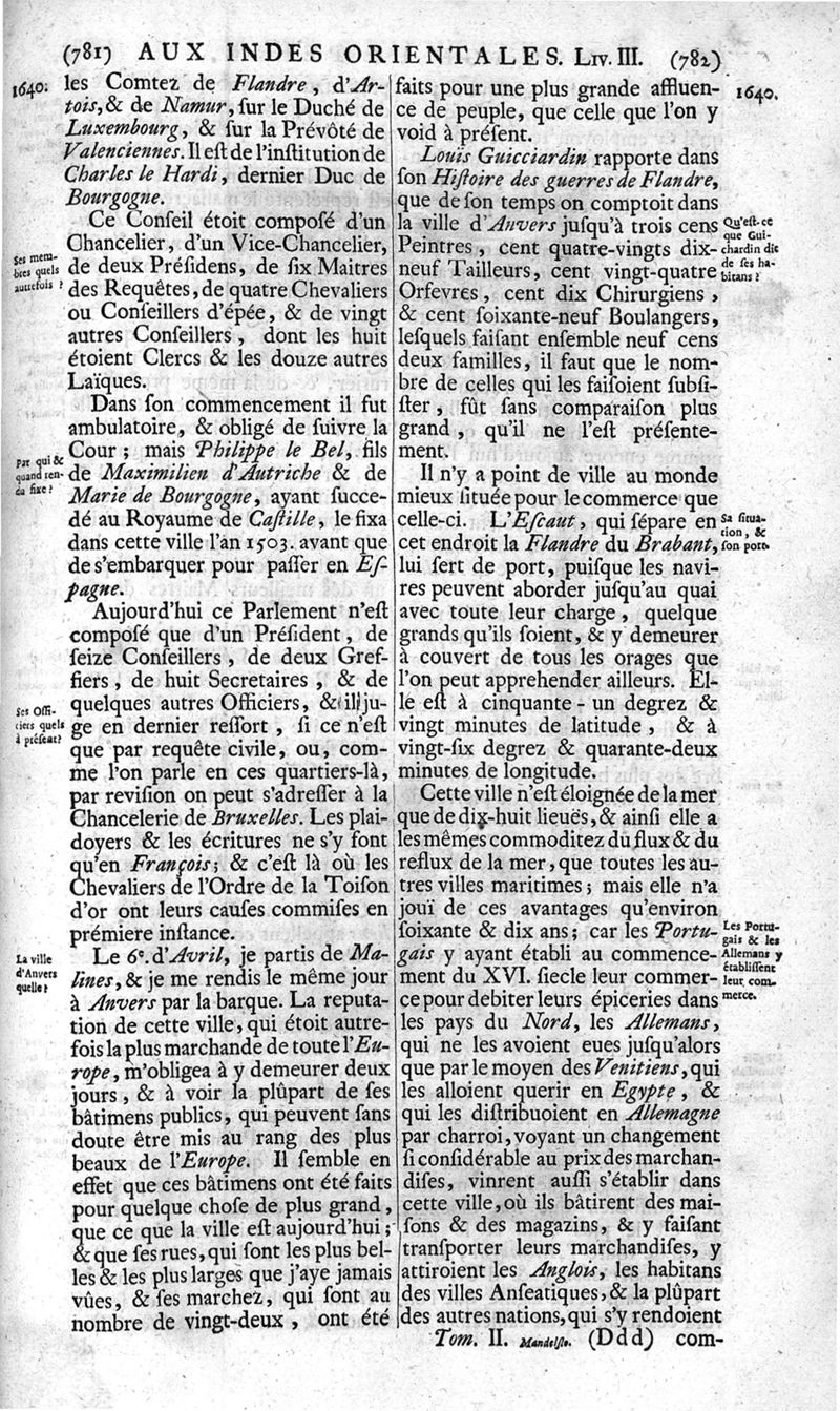 Voyages celebres & remarquables, faits de Perse aux Indes Orientales, par le sr. Jean-Albert de Mandelslo, gentilhomme des ambassadeurs du duc de Holstein en Moscovie & Perse. Contenant une description nouvelle & très-curieuse de l'Indostan, de l'empire du Grand-Mogol, des îles & presqu'îles de l'Orient, des royaumes de Siam, du Japon, de la Chine, du Congo, &c. Où l'on trouve la situation exacte de tous ces pays & etats ; & où l'on rapporte assez au long le naturel, les moeurs, & les coutumes de leurs habitans; leur gouvernement politique & ecclesiastique; les raretez qui se rencontrent dans ces pays; & les ceremonies qu'on y observe. Mis en ordre & publiez, après la mort de l'illustre voyageur, par le sr. Adam Olearius... Traduits de l'original par le sr. A. De Wicquefort ... Divisez en deux parties. Nouvelle edition revûe & corrigée exactement, augmentée considerablement, tant dans le corps de l'ouvrage qu'aux marginales, & surpassant en bonté & en beauté les précedentes editions. On y a encore ajouté des cartes géographiques, des représentations des villes, & autres taille-douces très-belles & très-exactes. On y trouve à la fin une Table fort ample & fort exacte. Tome premier [-second].
