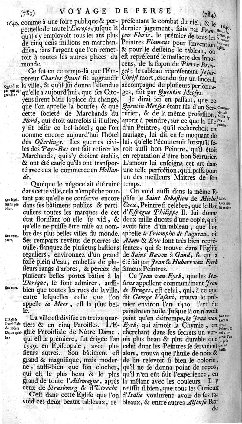 Voyages celebres & remarquables, faits de Perse aux Indes Orientales, par le sr. Jean-Albert de Mandelslo, gentilhomme des ambassadeurs du duc de Holstein en Moscovie & Perse. Contenant une description nouvelle & très-curieuse de l'Indostan, de l'empire du Grand-Mogol, des îles & presqu'îles de l'Orient, des royaumes de Siam, du Japon, de la Chine, du Congo, &c. Où l'on trouve la situation exacte de tous ces pays & etats ; & où l'on rapporte assez au long le naturel, les moeurs, & les coutumes de leurs habitans; leur gouvernement politique & ecclesiastique; les raretez qui se rencontrent dans ces pays; & les ceremonies qu'on y observe. Mis en ordre & publiez, après la mort de l'illustre voyageur, par le sr. Adam Olearius... Traduits de l'original par le sr. A. De Wicquefort ... Divisez en deux parties. Nouvelle edition revûe & corrigée exactement, augmentée considerablement, tant dans le corps de l'ouvrage qu'aux marginales, & surpassant en bonté & en beauté les précedentes editions. On y a encore ajouté des cartes géographiques, des représentations des villes, & autres taille-douces très-belles & très-exactes. On y trouve à la fin une Table fort ample & fort exacte. Tome premier [-second].