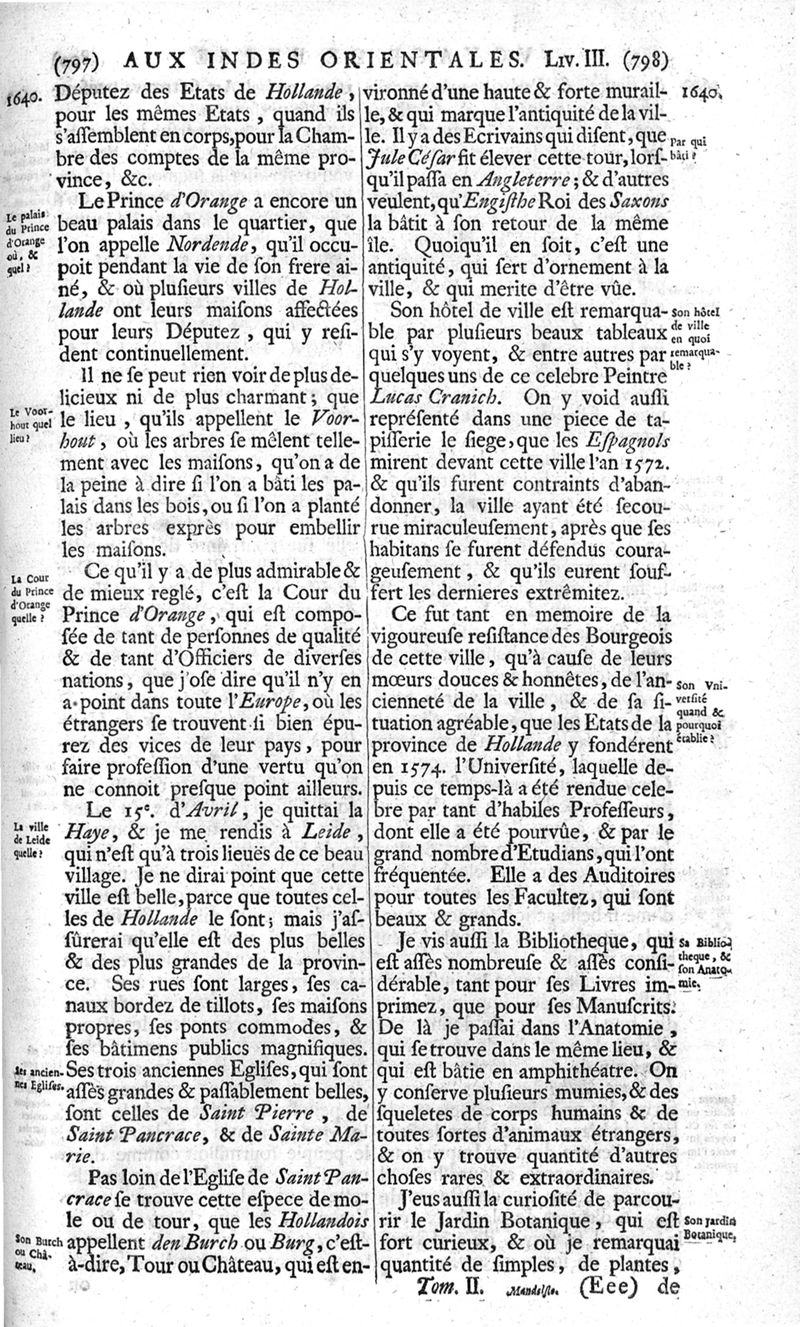 Voyages celebres & remarquables, faits de Perse aux Indes Orientales, par le sr. Jean-Albert de Mandelslo, gentilhomme des ambassadeurs du duc de Holstein en Moscovie & Perse. Contenant une description nouvelle & très-curieuse de l'Indostan, de l'empire du Grand-Mogol, des îles & presqu'îles de l'Orient, des royaumes de Siam, du Japon, de la Chine, du Congo, &c. Où l'on trouve la situation exacte de tous ces pays & etats ; & où l'on rapporte assez au long le naturel, les moeurs, & les coutumes de leurs habitans; leur gouvernement politique & ecclesiastique; les raretez qui se rencontrent dans ces pays; & les ceremonies qu'on y observe. Mis en ordre & publiez, après la mort de l'illustre voyageur, par le sr. Adam Olearius... Traduits de l'original par le sr. A. De Wicquefort ... Divisez en deux parties. Nouvelle edition revûe & corrigée exactement, augmentée considerablement, tant dans le corps de l'ouvrage qu'aux marginales, & surpassant en bonté & en beauté les précedentes editions. On y a encore ajouté des cartes géographiques, des représentations des villes, & autres taille-douces très-belles & très-exactes. On y trouve à la fin une Table fort ample & fort exacte. Tome premier [-second].