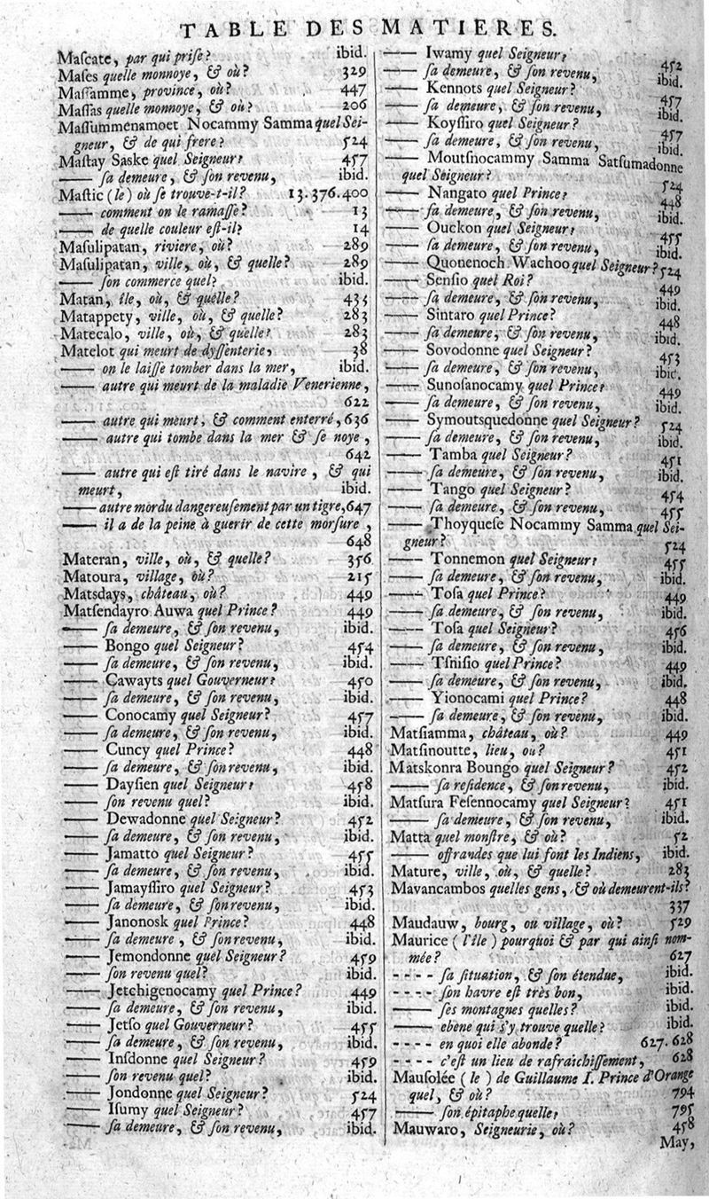 Voyages celebres & remarquables, faits de Perse aux Indes Orientales, par le sr. Jean-Albert de Mandelslo, gentilhomme des ambassadeurs du duc de Holstein en Moscovie & Perse. Contenant une description nouvelle & très-curieuse de l'Indostan, de l'empire du Grand-Mogol, des îles & presqu'îles de l'Orient, des royaumes de Siam, du Japon, de la Chine, du Congo, &c. Où l'on trouve la situation exacte de tous ces pays & etats ; & où l'on rapporte assez au long le naturel, les moeurs, & les coutumes de leurs habitans; leur gouvernement politique & ecclesiastique; les raretez qui se rencontrent dans ces pays; & les ceremonies qu'on y observe. Mis en ordre & publiez, après la mort de l'illustre voyageur, par le sr. Adam Olearius... Traduits de l'original par le sr. A. De Wicquefort ... Divisez en deux parties. Nouvelle edition revûe & corrigée exactement, augmentée considerablement, tant dans le corps de l'ouvrage qu'aux marginales, & surpassant en bonté & en beauté les précedentes editions. On y a encore ajouté des cartes géographiques, des représentations des villes, & autres taille-douces très-belles & très-exactes. On y trouve à la fin une Table fort ample & fort exacte. Tome premier [-second].