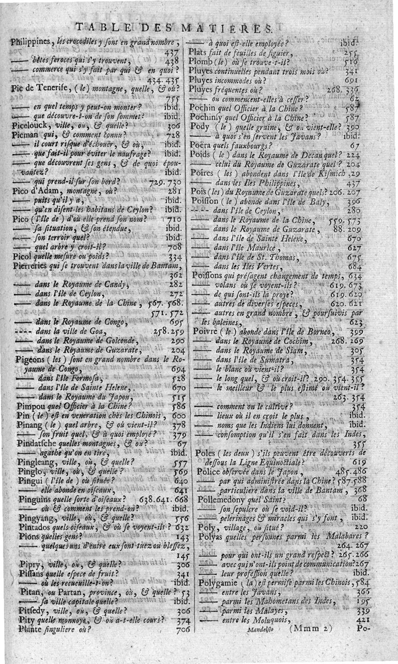 Voyages celebres & remarquables, faits de Perse aux Indes Orientales, par le sr. Jean-Albert de Mandelslo, gentilhomme des ambassadeurs du duc de Holstein en Moscovie & Perse. Contenant une description nouvelle & très-curieuse de l'Indostan, de l'empire du Grand-Mogol, des îles & presqu'îles de l'Orient, des royaumes de Siam, du Japon, de la Chine, du Congo, &c. Où l'on trouve la situation exacte de tous ces pays & etats ; & où l'on rapporte assez au long le naturel, les moeurs, & les coutumes de leurs habitans; leur gouvernement politique & ecclesiastique; les raretez qui se rencontrent dans ces pays; & les ceremonies qu'on y observe. Mis en ordre & publiez, après la mort de l'illustre voyageur, par le sr. Adam Olearius... Traduits de l'original par le sr. A. De Wicquefort ... Divisez en deux parties. Nouvelle edition revûe & corrigée exactement, augmentée considerablement, tant dans le corps de l'ouvrage qu'aux marginales, & surpassant en bonté & en beauté les précedentes editions. On y a encore ajouté des cartes géographiques, des représentations des villes, & autres taille-douces très-belles & très-exactes. On y trouve à la fin une Table fort ample & fort exacte. Tome premier [-second].