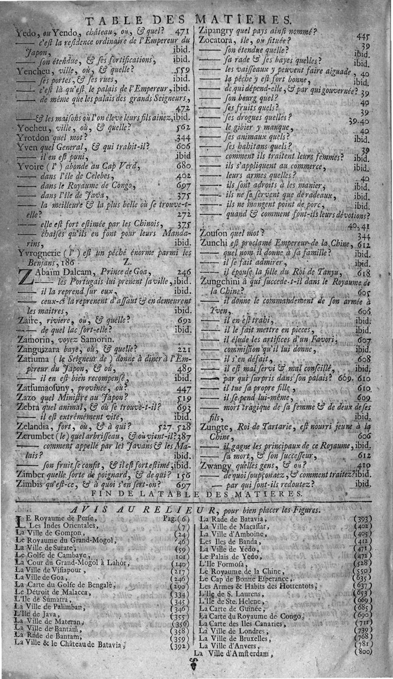 Voyages celebres & remarquables, faits de Perse aux Indes Orientales, par le sr. Jean-Albert de Mandelslo, gentilhomme des ambassadeurs du duc de Holstein en Moscovie & Perse. Contenant une description nouvelle & très-curieuse de l'Indostan, de l'empire du Grand-Mogol, des îles & presqu'îles de l'Orient, des royaumes de Siam, du Japon, de la Chine, du Congo, &c. Où l'on trouve la situation exacte de tous ces pays & etats ; & où l'on rapporte assez au long le naturel, les moeurs, & les coutumes de leurs habitans; leur gouvernement politique & ecclesiastique; les raretez qui se rencontrent dans ces pays; & les ceremonies qu'on y observe. Mis en ordre & publiez, après la mort de l'illustre voyageur, par le sr. Adam Olearius... Traduits de l'original par le sr. A. De Wicquefort ... Divisez en deux parties. Nouvelle edition revûe & corrigée exactement, augmentée considerablement, tant dans le corps de l'ouvrage qu'aux marginales, & surpassant en bonté & en beauté les précedentes editions. On y a encore ajouté des cartes géographiques, des représentations des villes, & autres taille-douces très-belles & très-exactes. On y trouve à la fin une Table fort ample & fort exacte. Tome premier [-second].