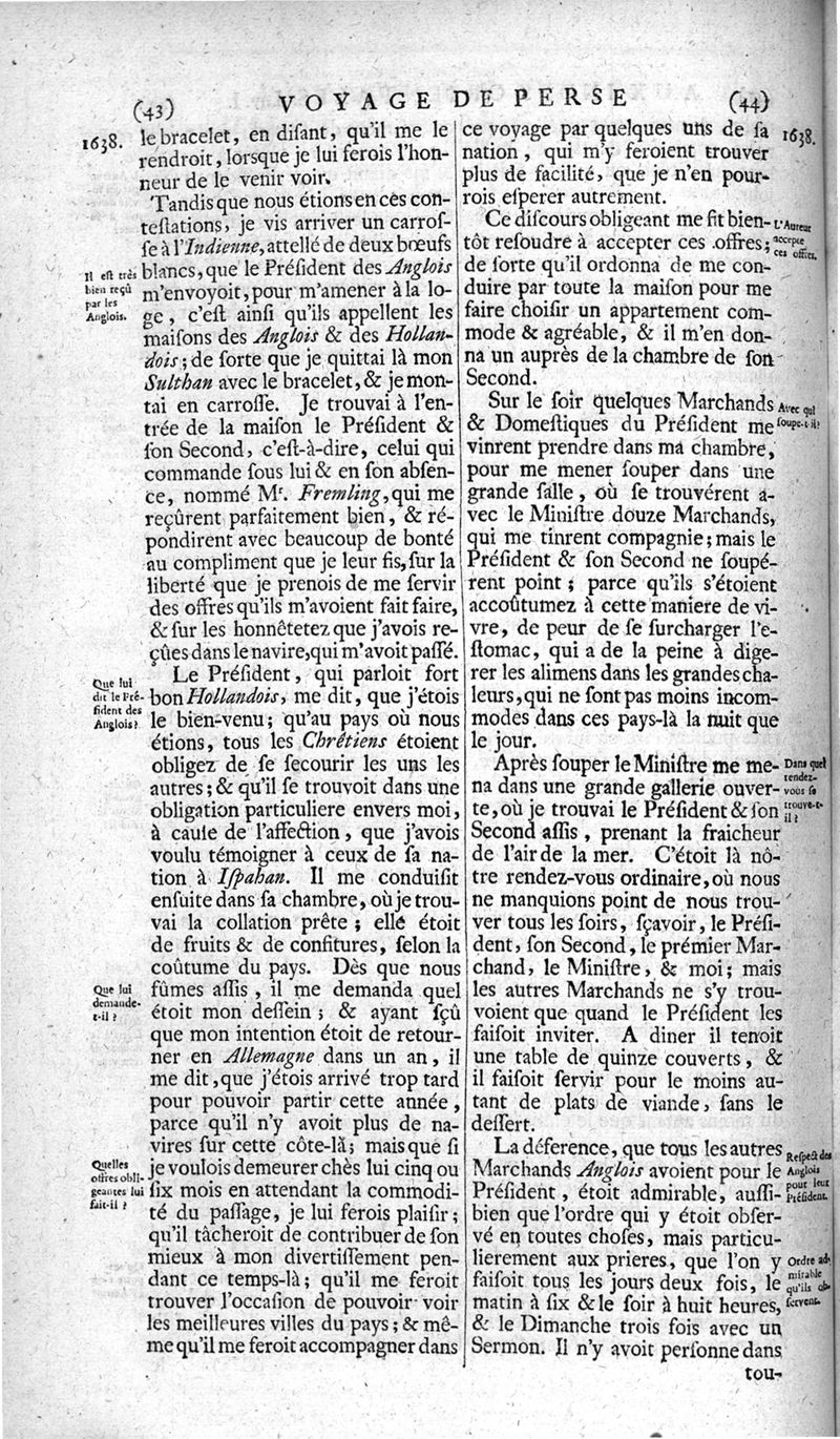 Voyages celebres & remarquables, faits de Perse aux Indes Orientales, par le sr. Jean-Albert de Mandelslo, gentilhomme des ambassadeurs du duc de Holstein en Moscovie & Perse. Contenant une description nouvelle & très-curieuse de l'Indostan, de l'empire du Grand-Mogol, des îles & presqu'îles de l'Orient, des royaumes de Siam, du Japon, de la Chine, du Congo, &c. Où l'on trouve la situation exacte de tous ces pays & etats ; & où l'on rapporte assez au long le naturel, les moeurs, & les coutumes de leurs habitans; leur gouvernement politique & ecclesiastique; les raretez qui se rencontrent dans ces pays; & les ceremonies qu'on y observe. Mis en ordre & publiez, après la mort de l'illustre voyageur, par le sr. Adam Olearius... Traduits de l'original par le sr. A. De Wicquefort ... Divisez en deux parties. Nouvelle edition revûe & corrigée exactement, augmentée considerablement, tant dans le corps de l'ouvrage qu'aux marginales, & surpassant en bonté & en beauté les précedentes editions. On y a encore ajouté des cartes géographiques, des représentations des villes, & autres taille-douces très-belles & très-exactes. On y trouve à la fin une Table fort ample & fort exacte. Tome premier [-second].