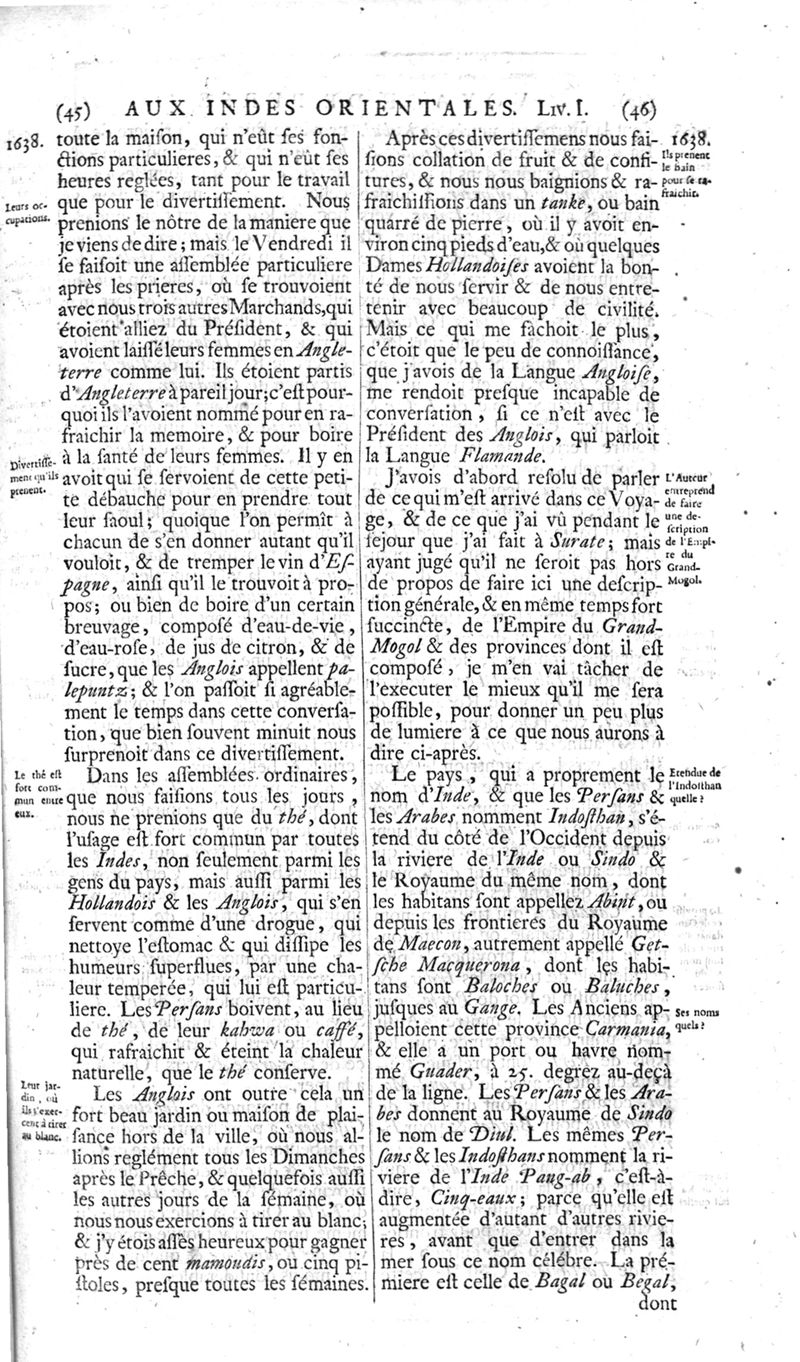 Voyages celebres & remarquables, faits de Perse aux Indes Orientales, par le sr. Jean-Albert de Mandelslo, gentilhomme des ambassadeurs du duc de Holstein en Moscovie & Perse. Contenant une description nouvelle & très-curieuse de l'Indostan, de l'empire du Grand-Mogol, des îles & presqu'îles de l'Orient, des royaumes de Siam, du Japon, de la Chine, du Congo, &c. Où l'on trouve la situation exacte de tous ces pays & etats ; & où l'on rapporte assez au long le naturel, les moeurs, & les coutumes de leurs habitans; leur gouvernement politique & ecclesiastique; les raretez qui se rencontrent dans ces pays; & les ceremonies qu'on y observe. Mis en ordre & publiez, après la mort de l'illustre voyageur, par le sr. Adam Olearius... Traduits de l'original par le sr. A. De Wicquefort ... Divisez en deux parties. Nouvelle edition revûe & corrigée exactement, augmentée considerablement, tant dans le corps de l'ouvrage qu'aux marginales, & surpassant en bonté & en beauté les précedentes editions. On y a encore ajouté des cartes géographiques, des représentations des villes, & autres taille-douces très-belles & très-exactes. On y trouve à la fin une Table fort ample & fort exacte. Tome premier [-second].