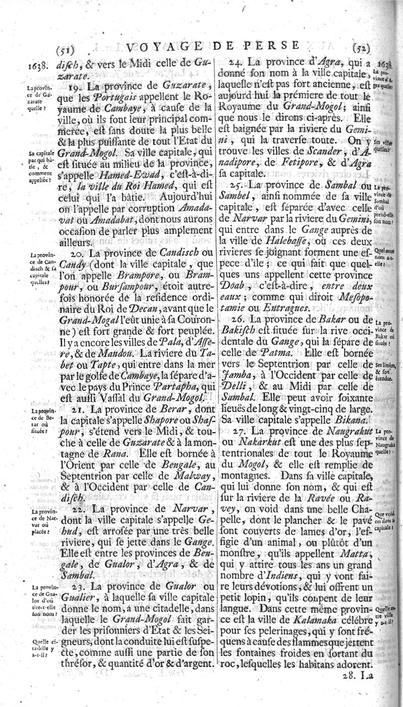 Voyages celebres & remarquables, faits de Perse aux Indes Orientales, par le sr. Jean-Albert de Mandelslo, gentilhomme des ambassadeurs du duc de Holstein en Moscovie & Perse. Contenant une description nouvelle & très-curieuse de l'Indostan, de l'empire du Grand-Mogol, des îles & presqu'îles de l'Orient, des royaumes de Siam, du Japon, de la Chine, du Congo, &c. Où l'on trouve la situation exacte de tous ces pays & etats ; & où l'on rapporte assez au long le naturel, les moeurs, & les coutumes de leurs habitans; leur gouvernement politique & ecclesiastique; les raretez qui se rencontrent dans ces pays; & les ceremonies qu'on y observe. Mis en ordre & publiez, après la mort de l'illustre voyageur, par le sr. Adam Olearius... Traduits de l'original par le sr. A. De Wicquefort ... Divisez en deux parties. Nouvelle edition revûe & corrigée exactement, augmentée considerablement, tant dans le corps de l'ouvrage qu'aux marginales, & surpassant en bonté & en beauté les précedentes editions. On y a encore ajouté des cartes géographiques, des représentations des villes, & autres taille-douces très-belles & très-exactes. On y trouve à la fin une Table fort ample & fort exacte. Tome premier [-second].