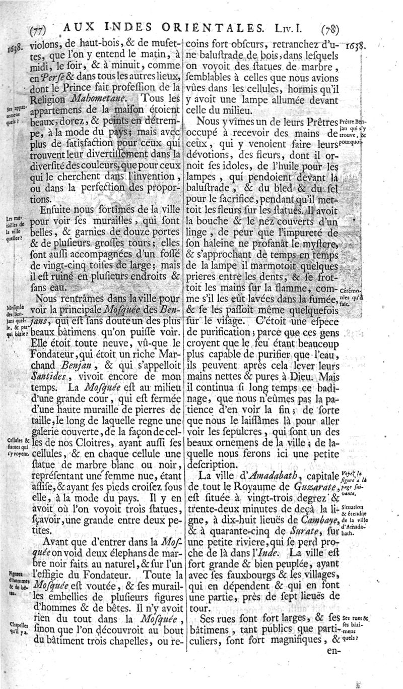 Voyages celebres & remarquables, faits de Perse aux Indes Orientales, par le sr. Jean-Albert de Mandelslo, gentilhomme des ambassadeurs du duc de Holstein en Moscovie & Perse. Contenant une description nouvelle & très-curieuse de l'Indostan, de l'empire du Grand-Mogol, des îles & presqu'îles de l'Orient, des royaumes de Siam, du Japon, de la Chine, du Congo, &c. Où l'on trouve la situation exacte de tous ces pays & etats ; & où l'on rapporte assez au long le naturel, les moeurs, & les coutumes de leurs habitans; leur gouvernement politique & ecclesiastique; les raretez qui se rencontrent dans ces pays; & les ceremonies qu'on y observe. Mis en ordre & publiez, après la mort de l'illustre voyageur, par le sr. Adam Olearius... Traduits de l'original par le sr. A. De Wicquefort ... Divisez en deux parties. Nouvelle edition revûe & corrigée exactement, augmentée considerablement, tant dans le corps de l'ouvrage qu'aux marginales, & surpassant en bonté & en beauté les précedentes editions. On y a encore ajouté des cartes géographiques, des représentations des villes, & autres taille-douces très-belles & très-exactes. On y trouve à la fin une Table fort ample & fort exacte. Tome premier [-second].