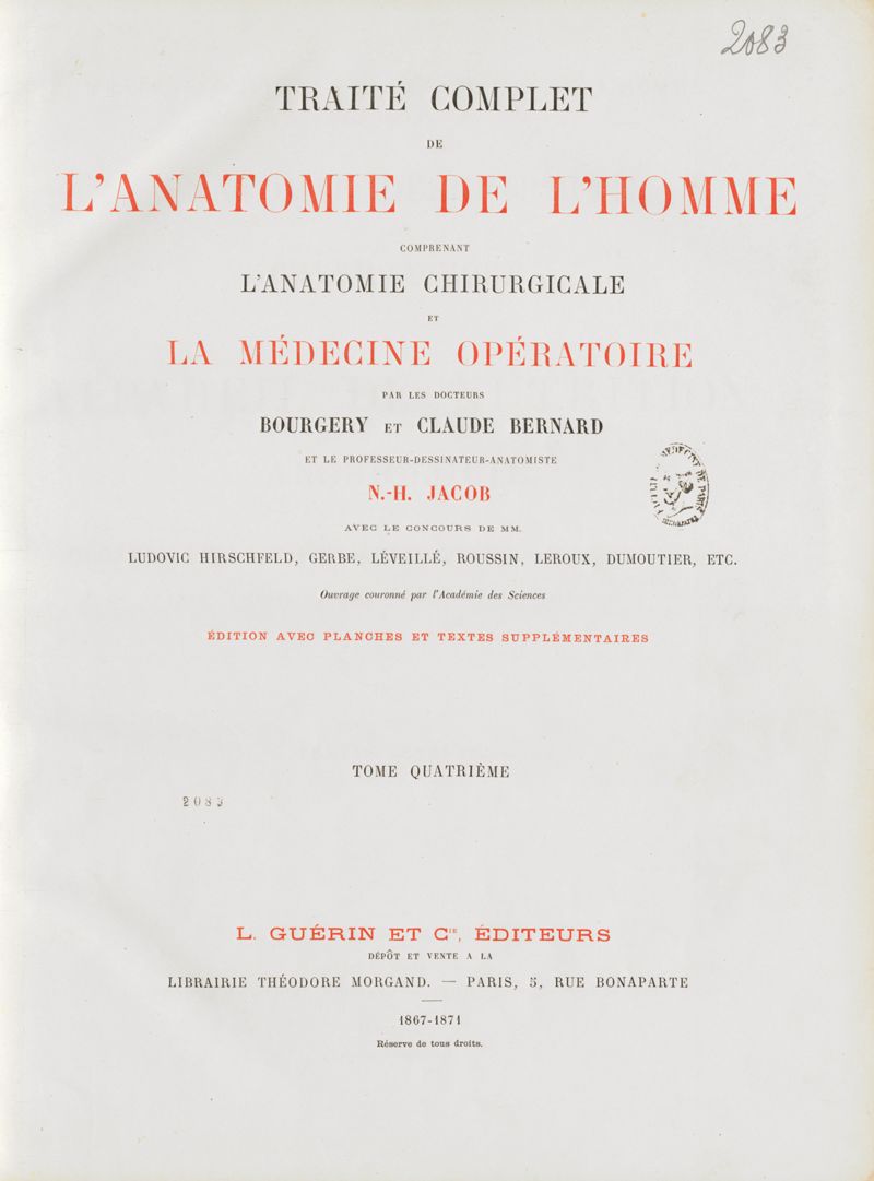 Traité complet de l'anatomie de l'homme, par les Drs Bourgery et Claude Bernard et le professeur-dessinateur-anatomiste N.H. Jacob, avec le concours de Ludovic Hirschfeld. Tome quatrième.