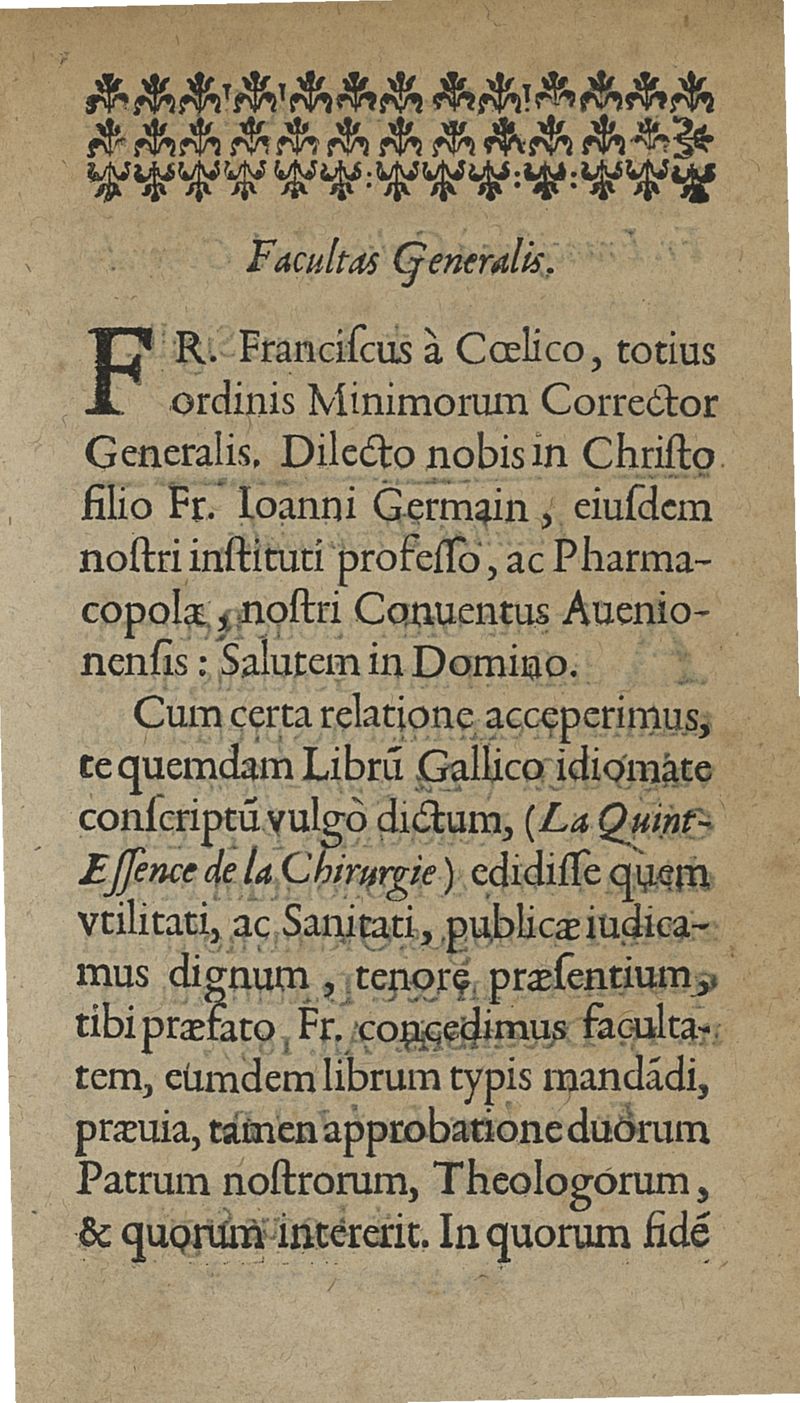 La parfaite quint-essence de la chirurgie reduicte en cinq parties. Avec un antidotaire...composée par Frere jean Germain provençal religieux Minime