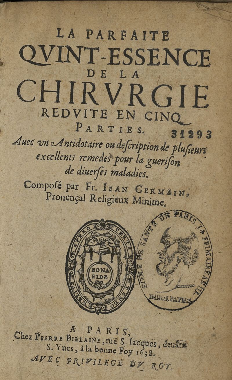 La parfaite quint-essence de la chirurgie reduicte en cinq parties. Avec un antidotaire...composée par Frere jean Germain provençal religieux Minime