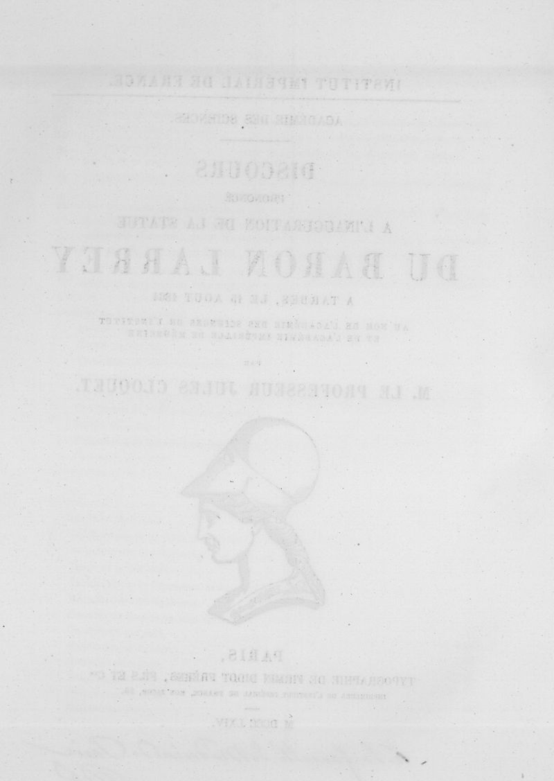 Institut impérial de France. Académie des sciences. Discours prononcé à l'inauguration de la statue du baron Larrey, à Tarbes, le 15 août 1864, au nom de l'Académie des Sciences, de l'Institut et de l'Académie impériale de médecine, par M. le professeur Jules Cloquet
