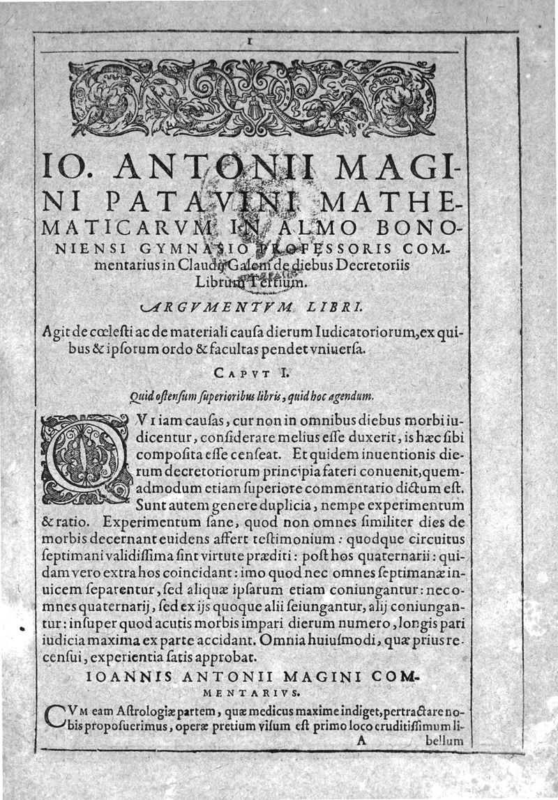 Io. Antonii Magini Patavini, Mathematicarum in almo Bononiensi Gymnasio Professoris, De Astrologica ratione, ac usu dierum Criticorum, seu Decretoriorum, ac praeterea de cognoscendis et medendis morbis ex corporum caelestium cognitione, opus ad ephemeridum supplementum nunc primo editum & libris duobus distinctum. Quorum primus complectitur commentarium in Claudii Galeni librum tertium De diebus decretoriis: alter agit de legitimo Astrologiae in medicina usu. His additur De annui temporis mensura in Directionibus: & de Directionibus ipsis ex Valentini Naibodae scriptis