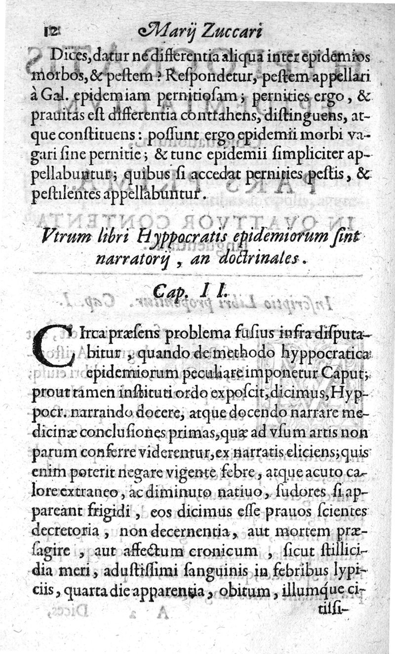 Hyppocratis epidemialium observationum pars prima. : Quatuor contenta languentibus. In qua ne dum praxis methodica, cum auxiliis legitur, sed etiam multa quaestiones, philosophis, ac medicis utilissime, proponuntur. Marii Zuccari philosophi ac medici Neapolitani ...