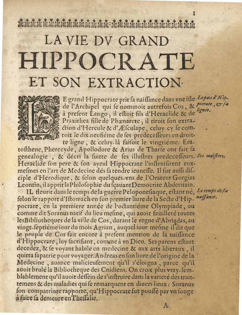 Les oeuvres du grand Hippocrate divisee en deux tomes ou toutes les classes de la vie de la naissance & de la conservation de la santé ; les signes & les symptomes de toutes les maladies sont nettenement expliquées avec leur guerison, par les lumieres du mouvement circulaire, et autres nouvelles experiences
