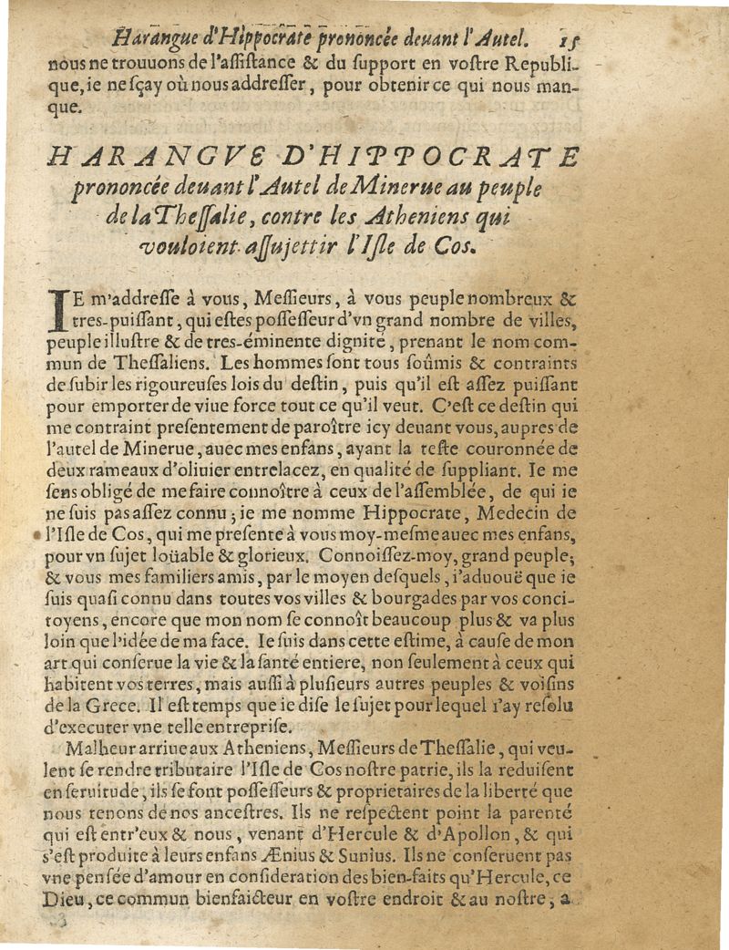 Les oeuvres du grand Hippocrate divisee en deux tomes ou toutes les classes de la vie de la naissance & de la conservation de la santé ; les signes & les symptomes de toutes les maladies sont nettenement expliquées avec leur guerison, par les lumieres du mouvement circulaire, et autres nouvelles experiences