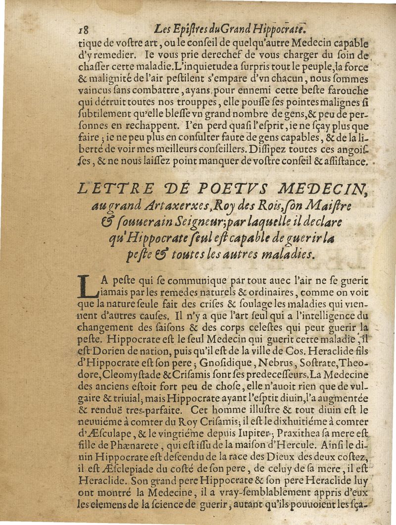 Les oeuvres du grand Hippocrate divisee en deux tomes ou toutes les classes de la vie de la naissance & de la conservation de la santé ; les signes & les symptomes de toutes les maladies sont nettenement expliquées avec leur guerison, par les lumieres du mouvement circulaire, et autres nouvelles experiences