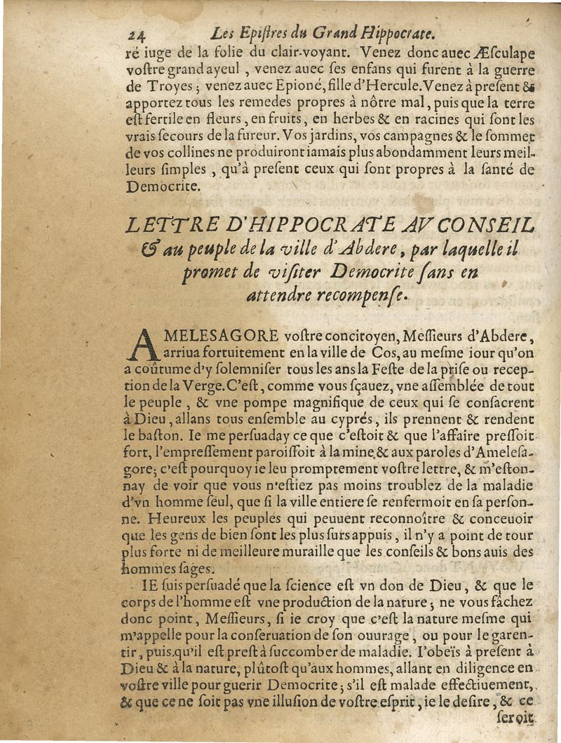 Les oeuvres du grand Hippocrate divisee en deux tomes ou toutes les classes de la vie de la naissance & de la conservation de la santé ; les signes & les symptomes de toutes les maladies sont nettenement expliquées avec leur guerison, par les lumieres du mouvement circulaire, et autres nouvelles experiences