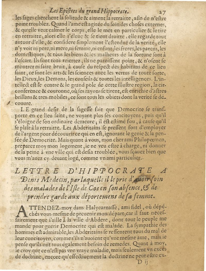 Les oeuvres du grand Hippocrate divisee en deux tomes ou toutes les classes de la vie de la naissance & de la conservation de la santé ; les signes & les symptomes de toutes les maladies sont nettenement expliquées avec leur guerison, par les lumieres du mouvement circulaire, et autres nouvelles experiences
