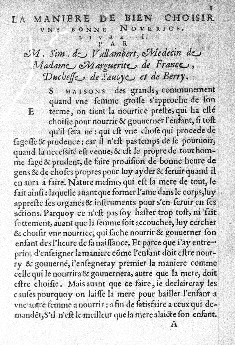 Cinq livres de la maniere de nourrir et gouverner les enfans des leur naissance. Par M. Simon de Vallambert, Medecin de madame la Duchesse de Savoye et de Berry, et depuys peu de temps, de monseigneur le Duc d’Orleans,