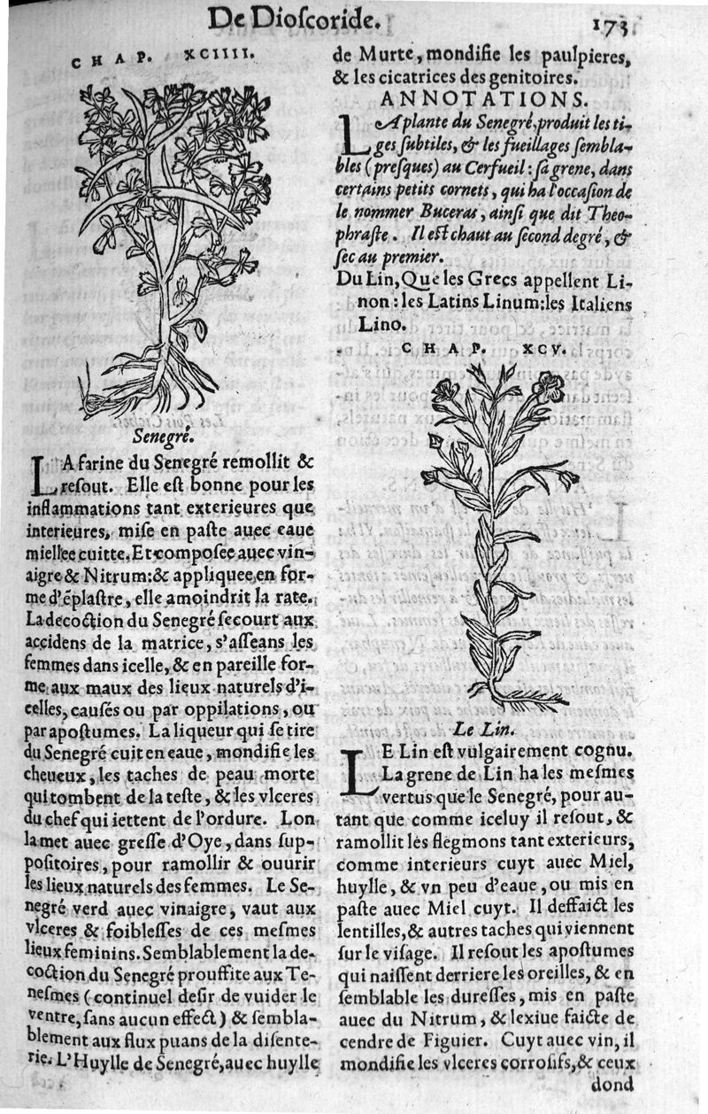 Les six livres de Pedacion Dioscoride d’Anazarbe, de la matiere medicale, translatez de Latin en François. A chacun Chapitre sont adjoustees certaines annotations fort doctes, et recueillies des plus excellens Medecins, anciens et modernes, Avec Privilege pour cinq ans,