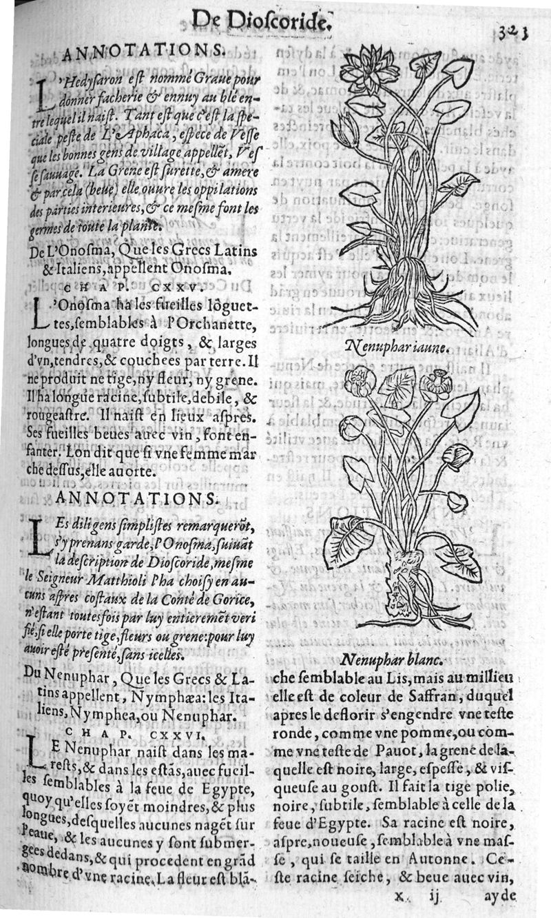 Les six livres de Pedacion Dioscoride d’Anazarbe, de la matiere medicale, translatez de Latin en François. A chacun Chapitre sont adjoustees certaines annotations fort doctes, et recueillies des plus excellens Medecins, anciens et modernes, Avec Privilege pour cinq ans,