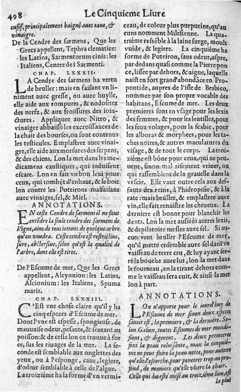 Les six livres de Pedacion Dioscoride d’Anazarbe, de la matiere medicale, translatez de Latin en François. A chacun Chapitre sont adjoustees certaines annotations fort doctes, et recueillies des plus excellens Medecins, anciens et modernes, Avec Privilege pour cinq ans,