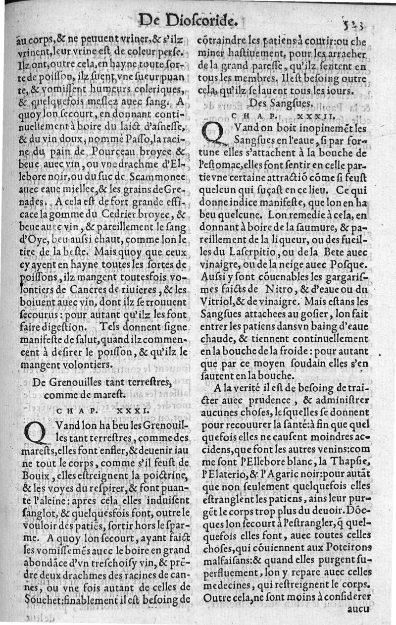 Les six livres de Pedacion Dioscoride d’Anazarbe, de la matiere medicale, translatez de Latin en François. A chacun Chapitre sont adjoustees certaines annotations fort doctes, et recueillies des plus excellens Medecins, anciens et modernes, Avec Privilege pour cinq ans,