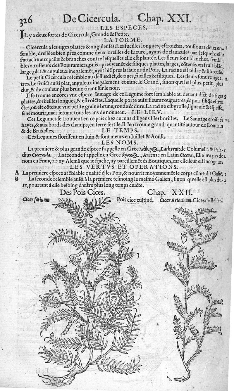 Histoire des plantes, en laquelle est contenue la description entiere des herbes, c’est à dire, leurs Especes, Forme, Noms, Temperament, Vertus et Operations : non seulement de celles qui croissent en ce païs, mais aussi des autres estrangeres qui viennent en usage de Medecine. Par Rembert Dodoens Medecin de la Ville de Malines. Nouvellement traduite de bas Aleman en François par Charles de l’Escluse