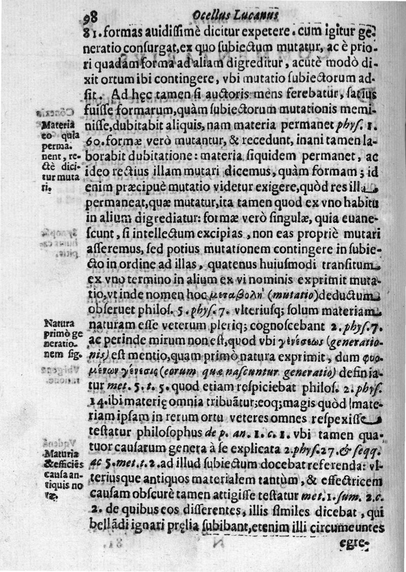 Okellos o Leukanos philosophos... Ocellus Lucanus philosophus De vniversi natura textum è Graeco in Latinum transtulit, collatisque multis exemplaribus etiam M.SS. emendauit, paraphrasi, & commentario illustrauit Carolus Emmanuel Vizzanius ... Pars physica