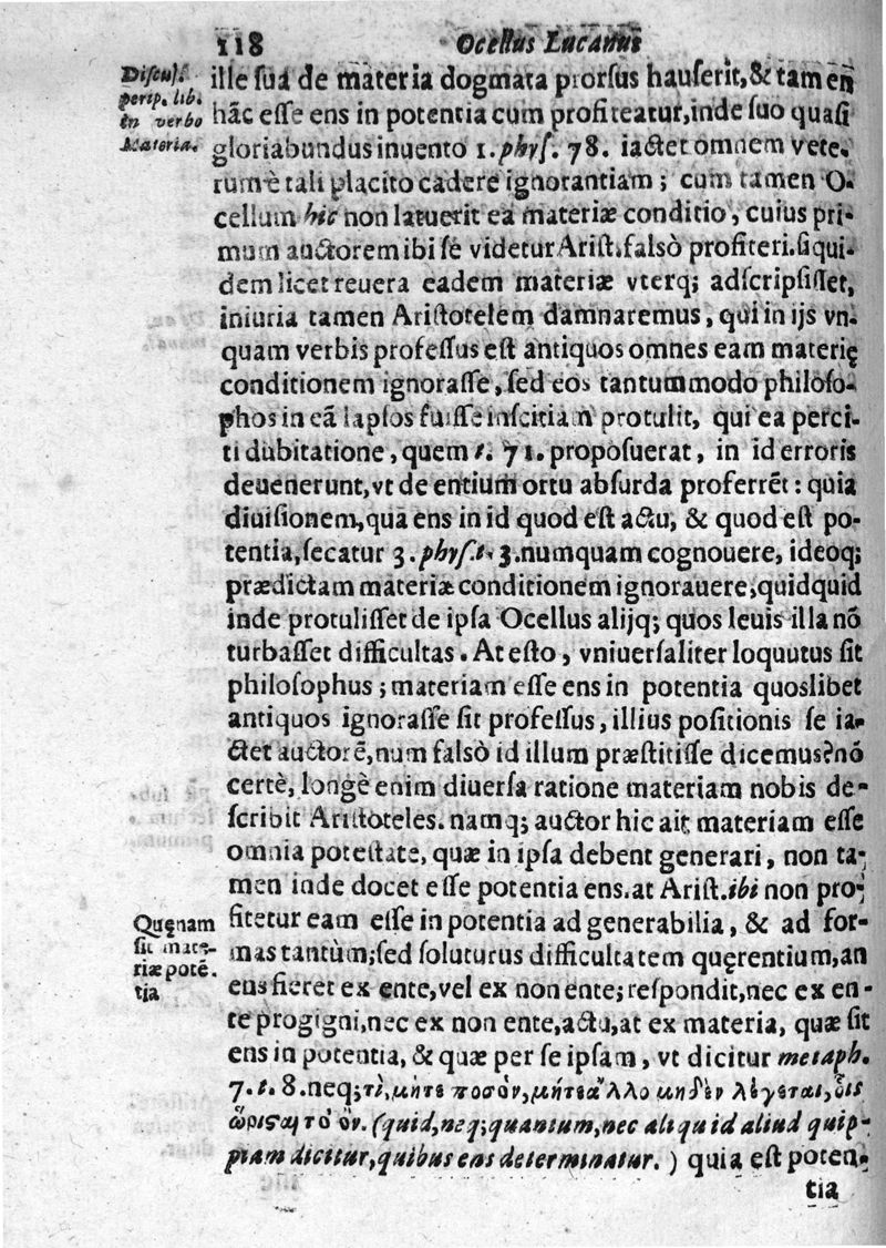 Okellos o Leukanos philosophos... Ocellus Lucanus philosophus De vniversi natura textum è Graeco in Latinum transtulit, collatisque multis exemplaribus etiam M.SS. emendauit, paraphrasi, & commentario illustrauit Carolus Emmanuel Vizzanius ... Pars physica