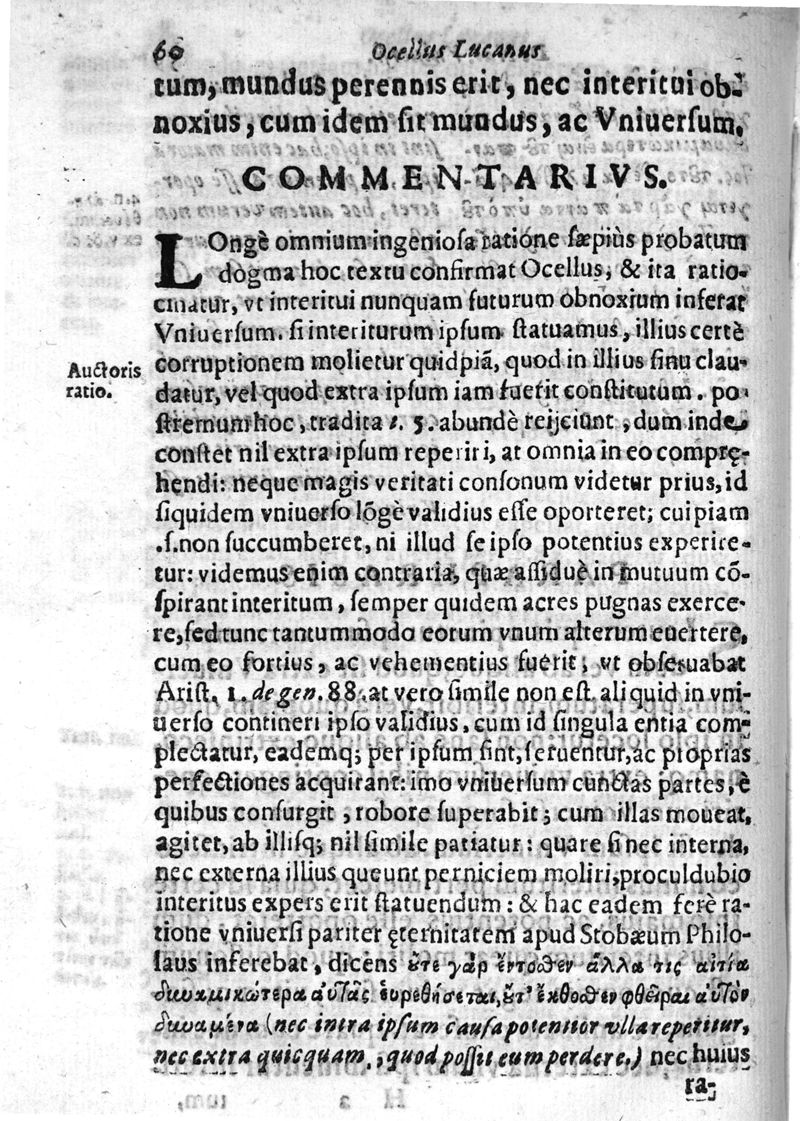Okellos o Leukanos philosophos... Ocellus Lucanus philosophus De vniversi natura textum è Graeco in Latinum transtulit, collatisque multis exemplaribus etiam M.SS. emendauit, paraphrasi, & commentario illustrauit Carolus Emmanuel Vizzanius ... Pars physica
