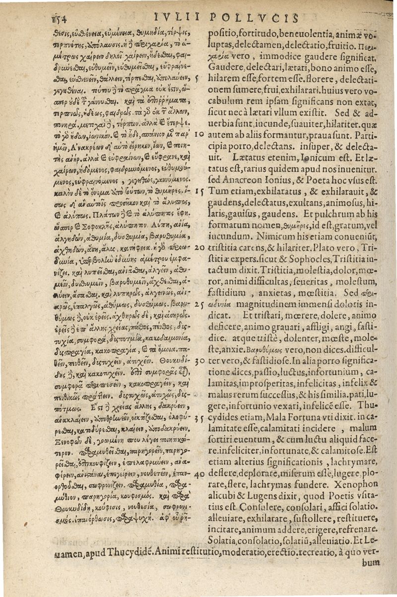 Iouliou Polydeukous Onomastikon en bibliois deka. Iulii Pollucis Onomasticon, decem libris constans : e MSS. codd. Bibliothecarum Palatinae atque Augustanae; variis item doctorum virorum lucubrationibus quana fieri potuit diligentia emendatum ; suppletum quoq[ue] nonnullibi, & illustratum ; adiecta interpretatio Latine Rodolphi Gualtheri, locis quamplurimis melior facta : indices item noui prioribus locupletiores ; & notæ studio atque operâ Wolfgangi Seberi Sulani.