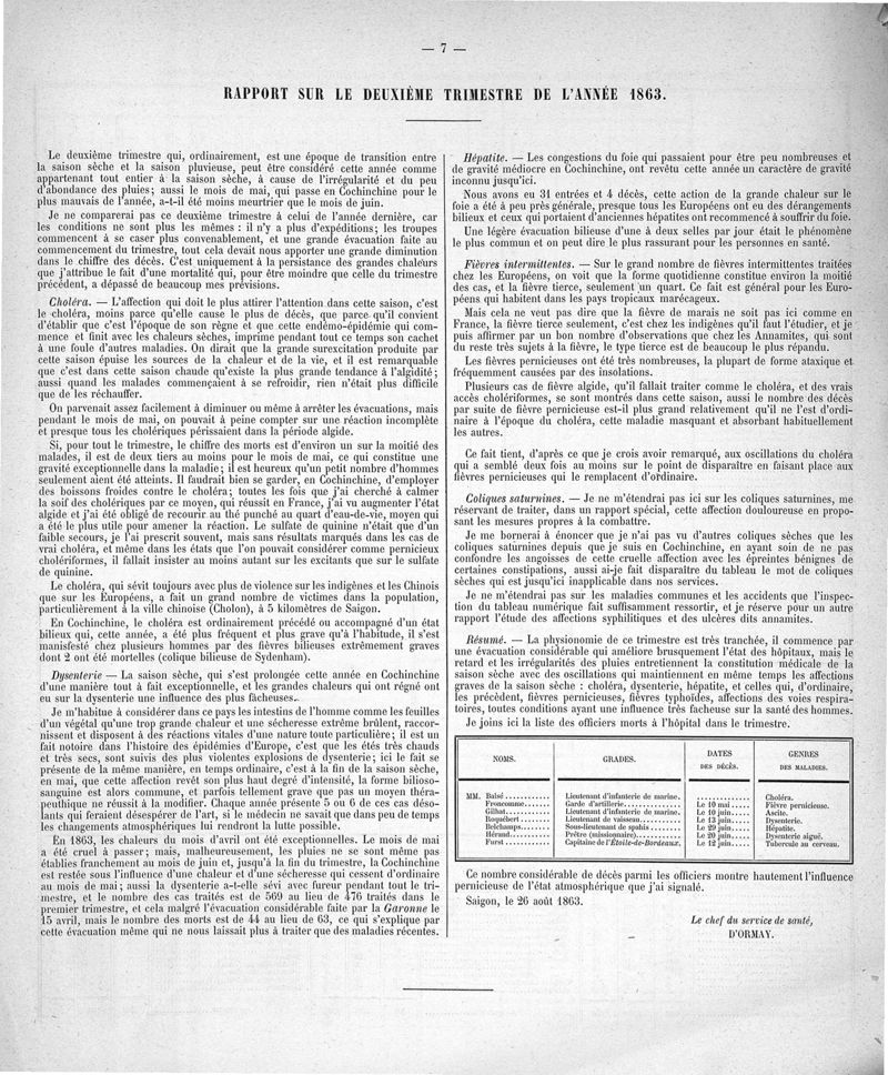 Cochinchine française, statistique médicale de 1863 à 1870