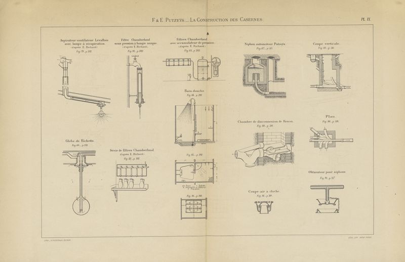Hygiène des agglomérations militaires : la construction des casernes. Atlas de 10 planches en lithographie