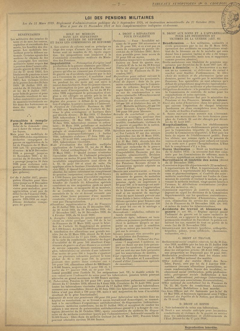 Lois sociales (assistance, réparation, assurances), exercice de la médecine. Tableaux synoptiques du cours de la chaire d'assistance médico-sociale de la Faculté de médecine de Paris