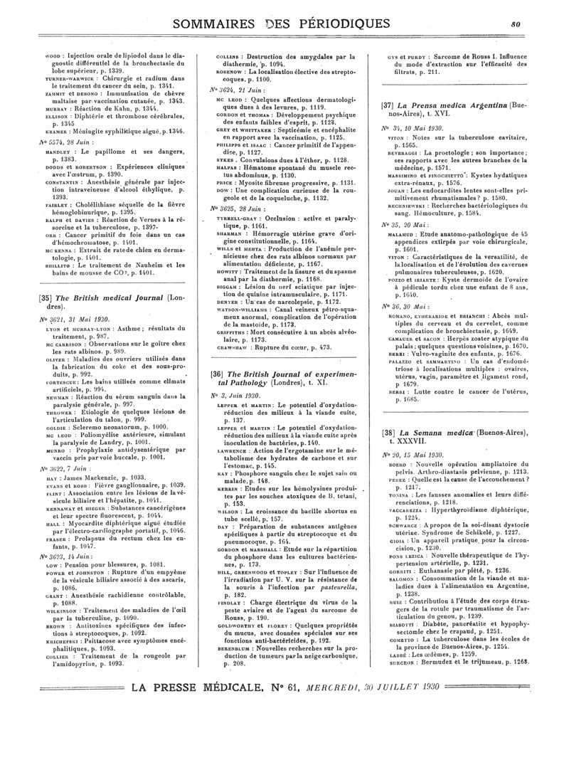 1930, Sommaires des périodiques. -